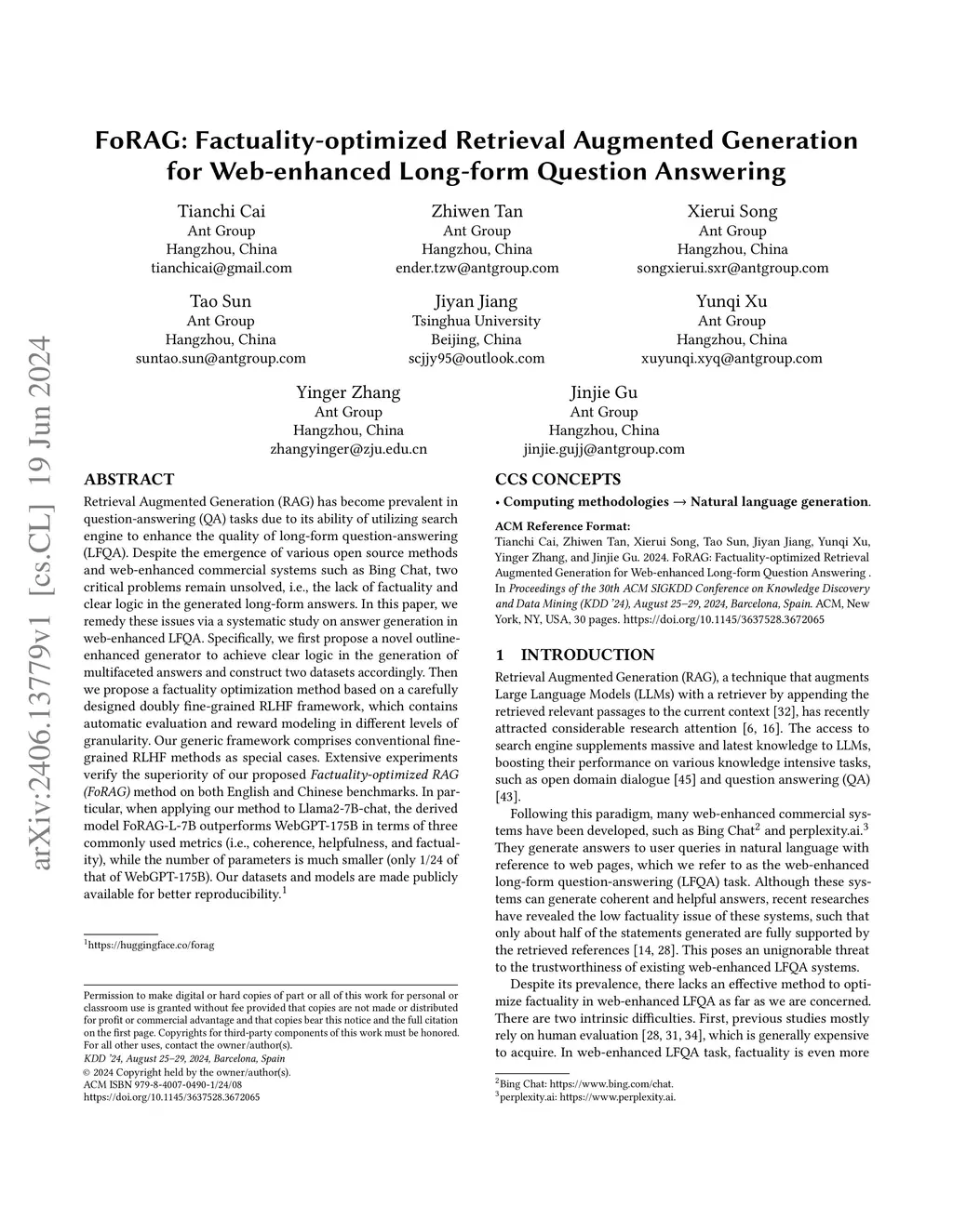 Retrieval Augmented Generation (RAG) has become prevalent in question-answering (QA) tasks due to its ability of utilizing search engine to enhance the quality of long-form question-answering (LFQA). Despite the emergence of various open source methods and web-enhanced commercial systems such as Bing Chat, two critical problems remain unsolved, i.e., the lack of factuality and clear logic in the generated long-form answers. In this paper, we remedy these issues via a systematic study on answer generation in web-enhanced LFQA. Specifically, we first propose a novel outline-enhanced generator to achieve clear logic in the generation of multifaceted answers and construct two datasets accordingly. Then we propose a factuality optimization method based on a carefully designed doubly fine-grained RLHF framework, which contains automatic evaluation and reward modeling in different levels of granularity. Our generic framework comprises conventional fine-grained RLHF methods as special cases. Extensive experiments verify the superiority of our proposed \textit{Factuality-optimized RAG (FoRAG)} method on both English and Chinese benchmarks. In particular, when applying our method to Llama2-7B-chat, the derived model FoRAG-L-7B outperforms WebGPT-175B in terms of three commonly used metrics (i.e., coherence, helpfulness, and factuality), while the number of parameters is much smaller (only 1/24 of that of WebGPT-175B). Our datasets and models are made publicly available for better reproducibility: https://huggingface.co/forag.