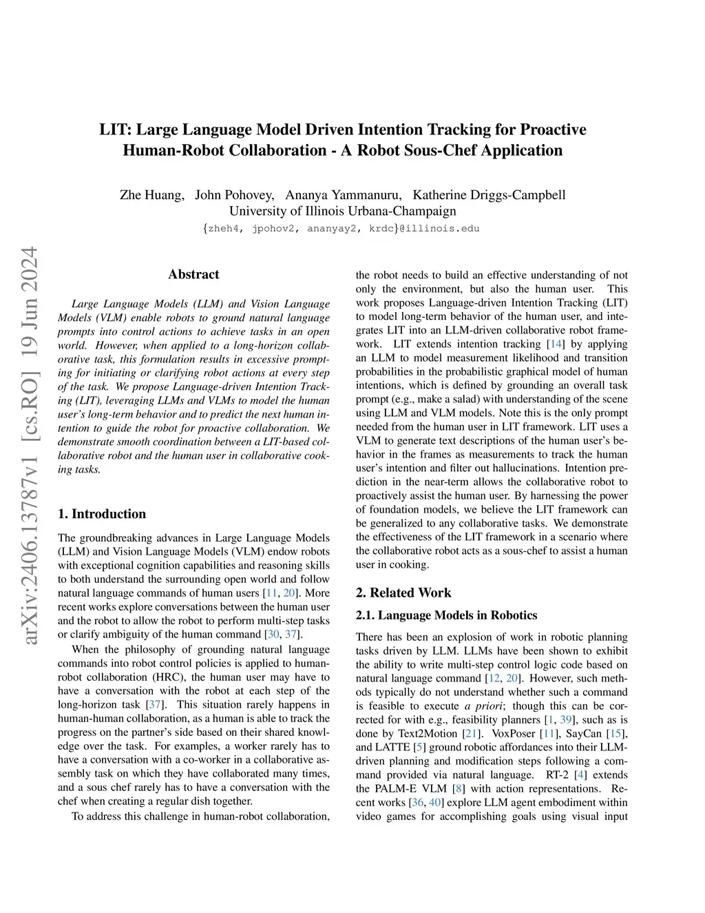 Large Language Models (LLM) and Vision Language Models (VLM) enable robots to ground natural language prompts into control actions to achieve tasks in an open world. However, when applied to a long-horizon collaborative task, this formulation results in excessive prompting for initiating or clarifying robot actions at every step of the task. We propose Language-driven Intention Tracking (LIT), leveraging LLMs and VLMs to model the human user's long-term behavior and to predict the next human intention to guide the robot for proactive collaboration. We demonstrate smooth coordination between a LIT-based collaborative robot and the human user in collaborative cooking tasks.