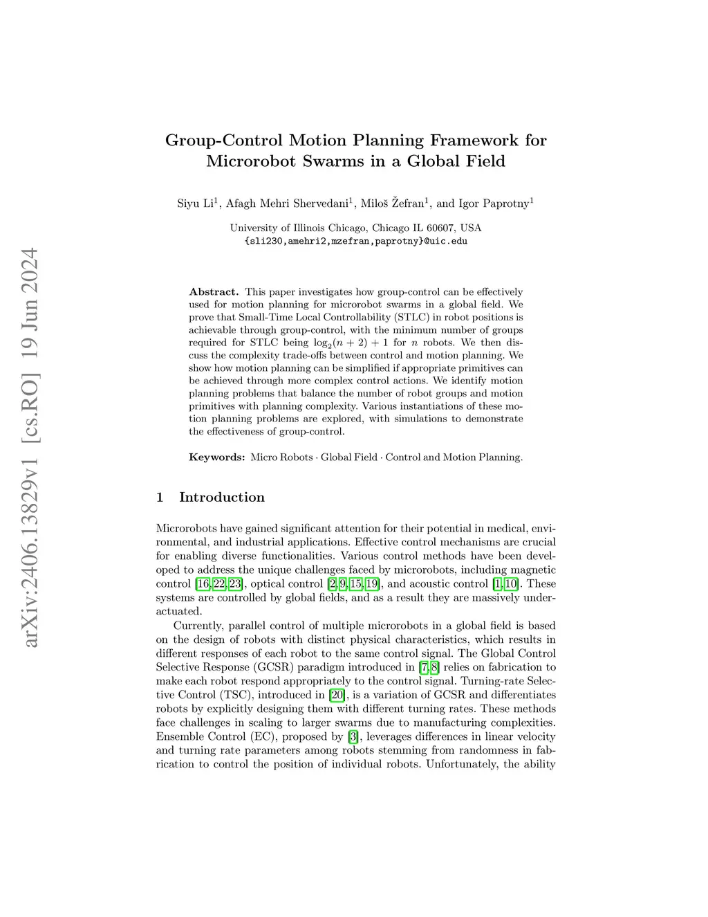 This paper investigates how group-control can be effectively used for motion planning for microrobot swarms in a global field. We prove that Small-Time Local Controllability (STLC) in robot positions is achievable through group-control, with the minimum number of groups required for STLC being for robots. We then discuss the complexity trade-offs between control and motion planning. We show how motion planning can be simplified if appropriate primitives can be achieved through more complex control actions. We identify motion planning problems that balance the number of robot groups and motion primitives with planning complexity. Various instantiations of these motion planning problems are explored, with simulations to demonstrate the effectiveness of group-control.