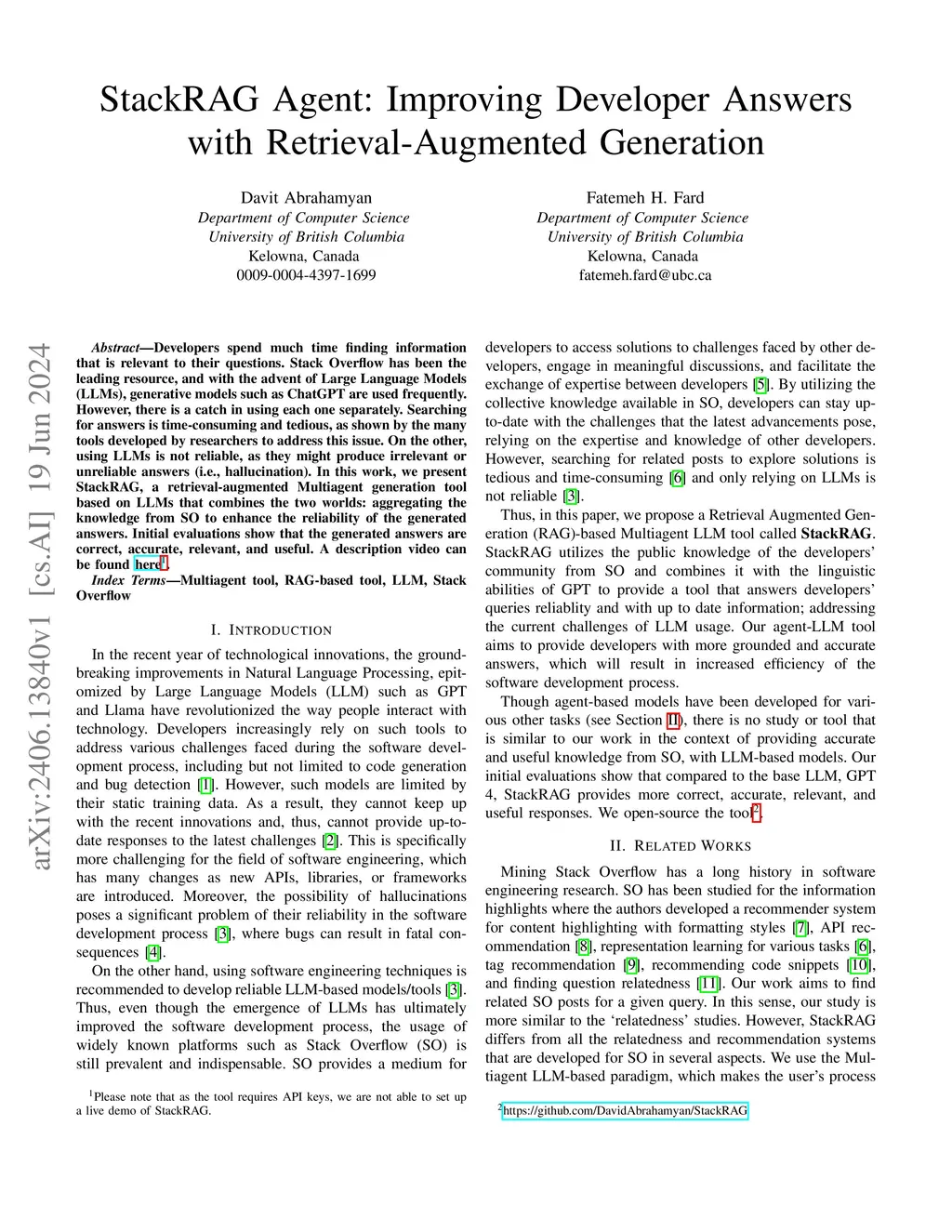 Developers spend much time finding information that is relevant to their questions. Stack Overflow has been the leading resource, and with the advent of Large Language Models (LLMs), generative models such as ChatGPT are used frequently. However, there is a catch in using each one separately. Searching for answers is time-consuming and tedious, as shown by the many tools developed by researchers to address this issue. On the other, using LLMs is not reliable, as they might produce irrelevant or unreliable answers (i.e., hallucination). In this work, we present StackRAG, a retrieval-augmented Multiagent generation tool based on LLMs that combines the two worlds: aggregating the knowledge from SO to enhance the reliability of the generated answers. Initial evaluations show that the generated answers are correct, accurate, relevant, and useful.