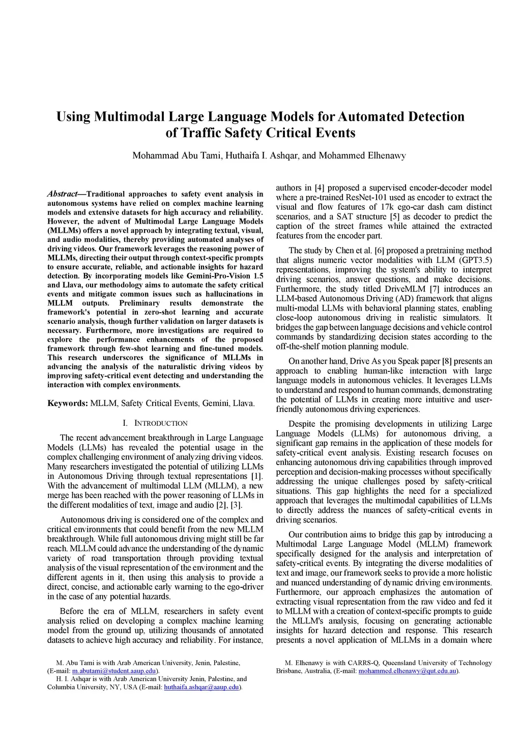 Traditional approaches to safety event analysis in autonomous systems have relied on complex machine learning models and extensive datasets for high accuracy and reliability. However, the advent of Multimodal Large Language Models (MLLMs) offers a novel approach by integrating textual, visual, and audio modalities, thereby providing automated analyses of driving videos. Our framework leverages the reasoning power of MLLMs, directing their output through context-specific prompts to ensure accurate, reliable, and actionable insights for hazard detection. By incorporating models like Gemini-Pro-Vision 1.5 and Llava, our methodology aims to automate the safety critical events and mitigate common issues such as hallucinations in MLLM outputs. Preliminary results demonstrate the framework's potential in zero-shot learning and accurate scenario analysis, though further validation on larger datasets is necessary. Furthermore, more investigations are required to explore the performance enhancements of the proposed framework through few-shot learning and fine-tuned models. This research underscores the significance of MLLMs in advancing the analysis of the naturalistic driving videos by improving safety-critical event detecting and understanding the interaction with complex environments.