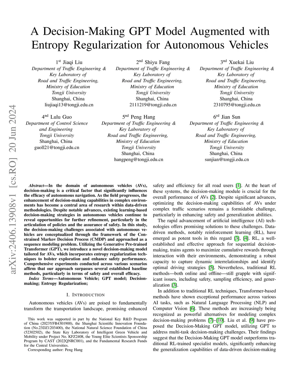 In the domain of autonomous vehicles (AVs), decision-making is a critical factor that significantly influences the efficacy of autonomous navigation. As the field progresses, the enhancement of decision-making capabilities in complex environments has become a central area of research within data-driven methodologies. Despite notable advances, existing learning-based decision-making strategies in autonomous vehicles continue to reveal opportunities for further refinement, particularly in the articulation of policies and the assurance of safety. In this study, the decision-making challenges associated with autonomous vehicles are conceptualized through the framework of the Constrained Markov Decision Process (CMDP) and approached as a sequence modeling problem. Utilizing the Generative Pre-trained Transformer (GPT), we introduce a novel decision-making model tailored for AVs, which incorporates entropy regularization techniques to bolster exploration and enhance safety performance. Comprehensive experiments conducted across various scenarios affirm that our approach surpasses several established baseline methods, particularly in terms of safety and overall efficacy.