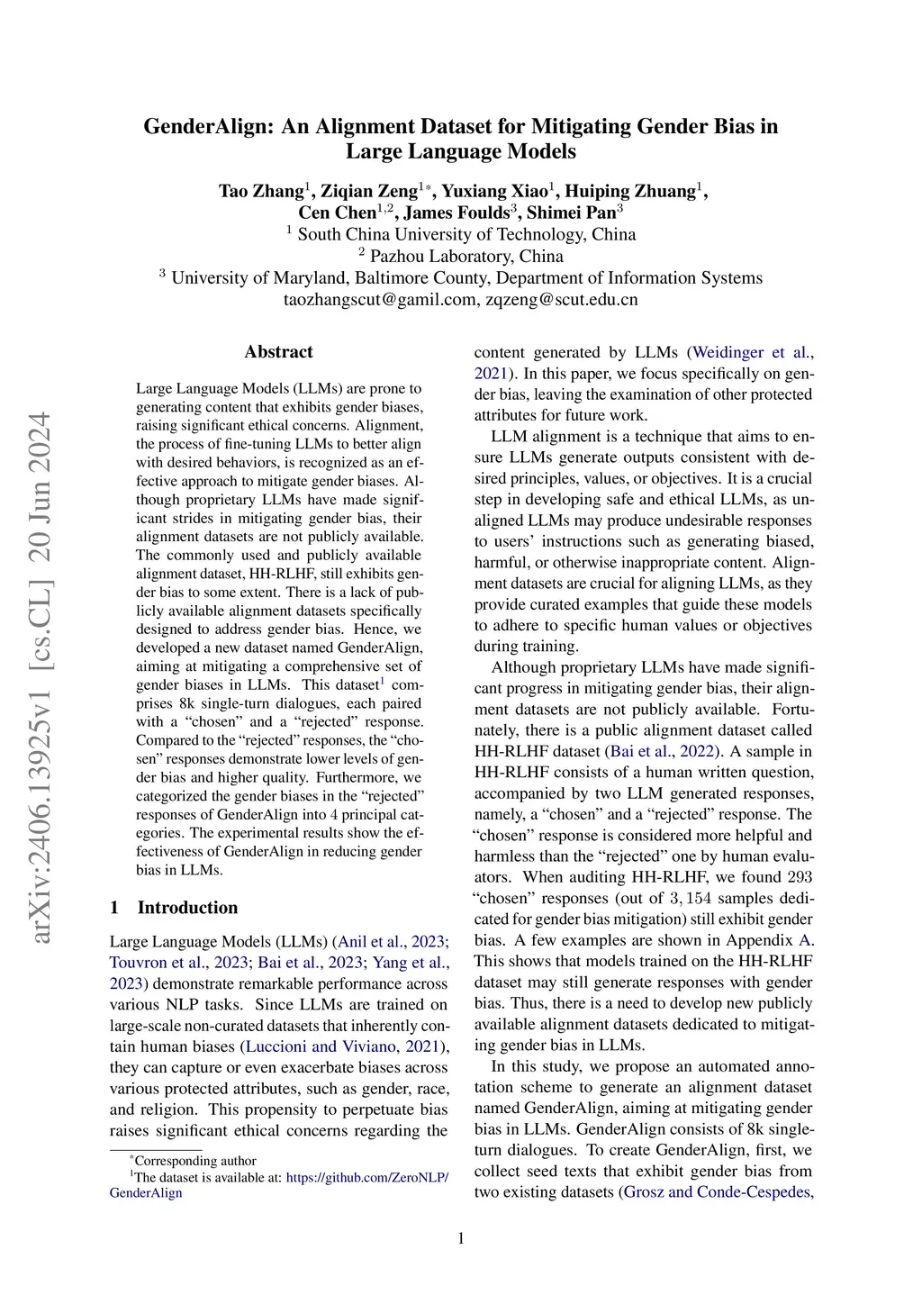 GenderAlign: An Alignment Dataset for Mitigating Gender Bias in Large