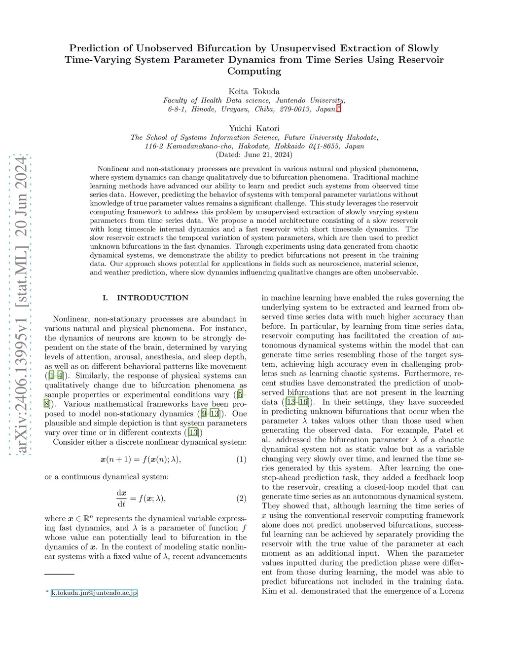 Nonlinear and non-stationary processes are prevalent in various natural and physical phenomena, where system dynamics can change qualitatively due to bifurcation phenomena. Traditional machine learning methods have advanced our ability to learn and predict such systems from observed time series data. However, predicting the behavior of systems with temporal parameter variations without knowledge of true parameter values remains a significant challenge. This study leverages the reservoir computing framework to address this problem by unsupervised extraction of slowly varying system parameters from time series data. We propose a model architecture consisting of a slow reservoir with long timescale internal dynamics and a fast reservoir with short timescale dynamics. The slow reservoir extracts the temporal variation of system parameters, which are then used to predict unknown bifurcations in the fast dynamics. Through experiments using data generated from chaotic dynamical systems, we demonstrate the ability to predict bifurcations not present in the training data. Our approach shows potential for applications in fields such as neuroscience, material science, and weather prediction, where slow dynamics influencing qualitative changes are often unobservable.