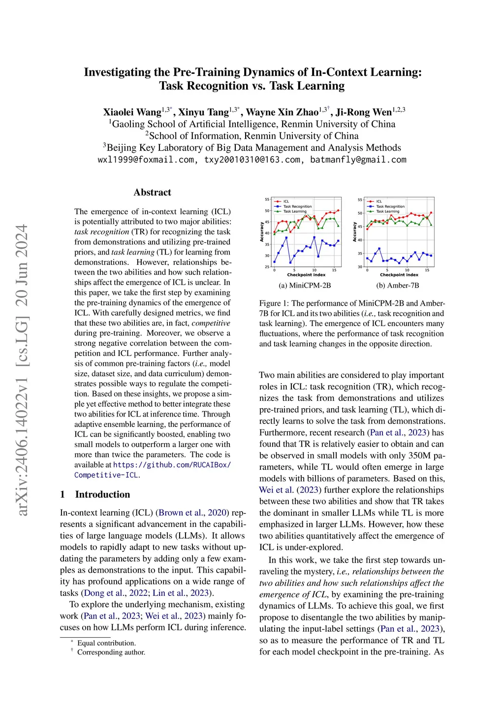 The emergence of in-context learning (ICL) is potentially attributed to two major abilities: task recognition (TR) for recognizing the task from demonstrations and utilizing pre-trained priors, and task learning (TL) for learning from demonstrations. However, relationships between the two abilities and how such relationships affect the emergence of ICL is unclear. In this paper, we take the first step by examining the pre-training dynamics of the emergence of ICL. With carefully designed metrics, we find that these two abilities are, in fact, competitive during pre-training. Moreover, we observe a strong negative correlation between the competition and ICL performance. Further analysis of common pre-training factors (i.e., model size, dataset size, and data curriculum) demonstrates possible ways to manage the competition. Based on these insights, we propose a simple yet effective method to better integrate these two abilities for ICL at inference time. Through adaptive ensemble learning, the performance of ICL can be significantly boosted, enabling two small models to outperform a larger one with more than twice the parameters. The code is available at https://github.com/RUCAIBox/Competitive-ICL.