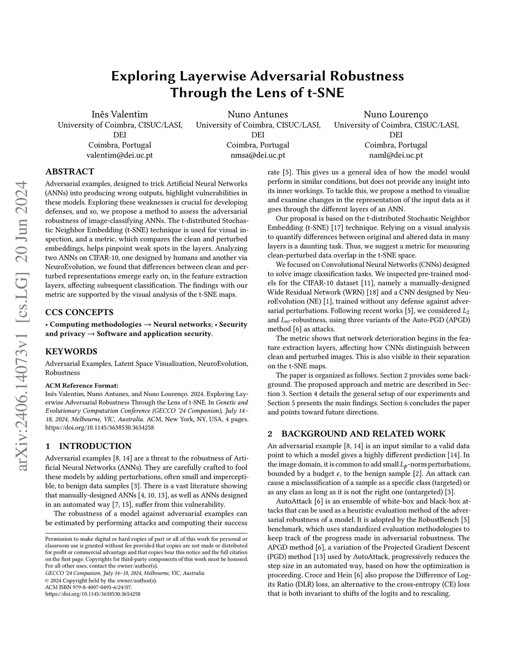 Adversarial examples, designed to trick Artificial Neural Networks (ANNs) into producing wrong outputs, highlight vulnerabilities in these models. Exploring these weaknesses is crucial for developing defenses, and so, we propose a method to assess the adversarial robustness of image-classifying ANNs. The t-distributed Stochastic Neighbor Embedding (t-SNE) technique is used for visual inspection, and a metric, which compares the clean and perturbed embeddings, helps pinpoint weak spots in the layers. Analyzing two ANNs on CIFAR-10, one designed by humans and another via NeuroEvolution, we found that differences between clean and perturbed representations emerge early on, in the feature extraction layers, affecting subsequent classification. The findings with our metric are supported by the visual analysis of the t-SNE maps.