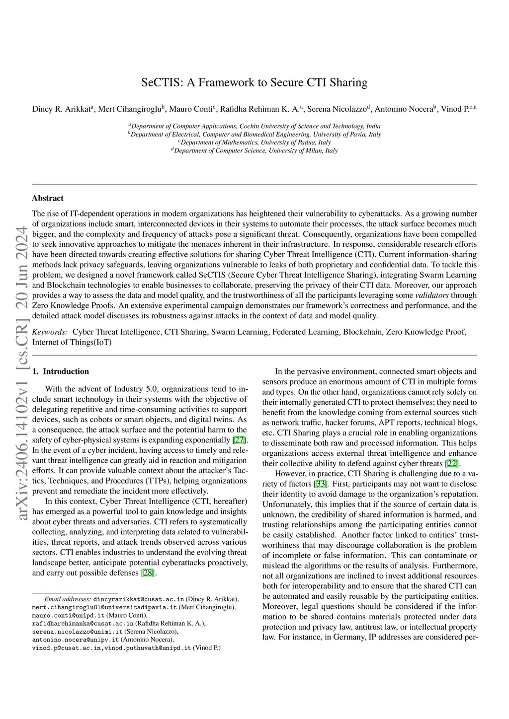 The rise of IT-dependent operations in modern organizations has heightened their vulnerability to cyberattacks. As a growing number of organizations include smart, interconnected devices in their systems to automate their processes, the attack surface becomes much bigger, and the complexity and frequency of attacks pose a significant threat. Consequently, organizations have been compelled to seek innovative approaches to mitigate the menaces inherent in their infrastructure. In response, considerable research efforts have been directed towards creating effective solutions for sharing Cyber Threat Intelligence (CTI). Current information-sharing methods lack privacy safeguards, leaving organizations vulnerable to leaks of both proprietary and confidential data. To tackle this problem, we designed a novel framework called SeCTIS (Secure Cyber Threat Intelligence Sharing), integrating Swarm Learning and Blockchain technologies to enable businesses to collaborate, preserving the privacy of their CTI data. Moreover, our approach provides a way to assess the data and model quality, and the trustworthiness of all the participants leveraging some validators through Zero Knowledge Proofs. An extensive experimental campaign demonstrates our framework's correctness and performance, and the detailed attack model discusses its robustness against attacks in the context of data and model quality.