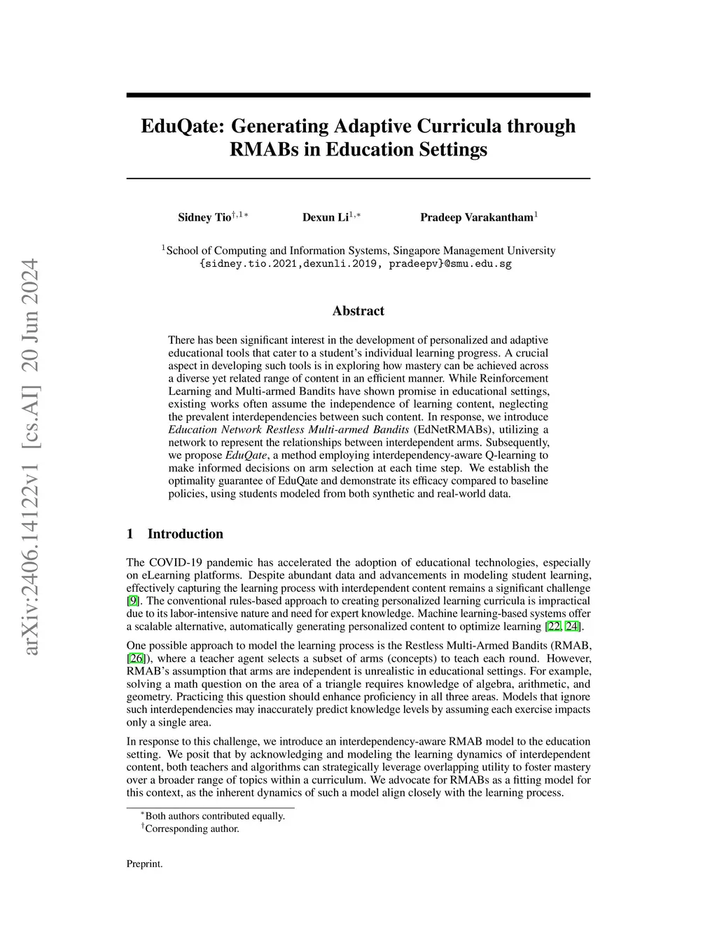 EduQate: Generating Adaptive Curricula through RMABs in Education