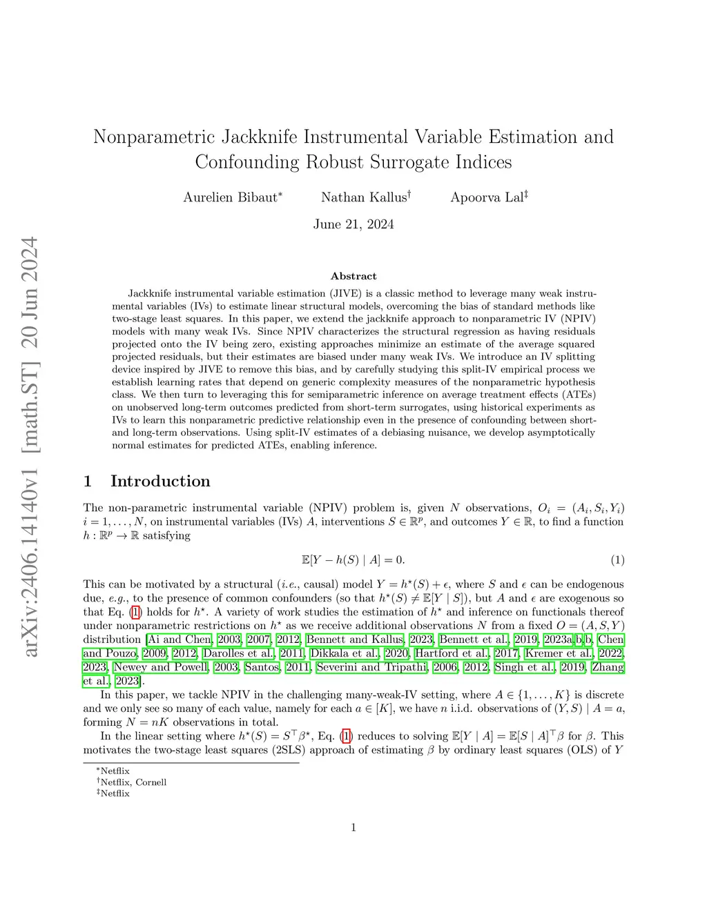 Jackknife instrumental variable estimation (JIVE) is a classic method to leverage many weak instrumental variables (IVs) to estimate linear structural models, overcoming the bias of standard methods like two-stage least squares. In this paper, we extend the jackknife approach to nonparametric IV (NPIV) models with many weak IVs. Since NPIV characterizes the structural regression as having residuals projected onto the IV being zero, existing approaches minimize an estimate of the average squared projected residuals, but their estimates are biased under many weak IVs. We introduce an IV splitting device inspired by JIVE to remove this bias, and by carefully studying this split-IV empirical process we establish learning rates that depend on generic complexity measures of the nonparametric hypothesis class. We then turn to leveraging this for semiparametric inference on average treatment effects (ATEs) on unobserved long-term outcomes predicted from short-term surrogates, using historical experiments as IVs to learn this nonparametric predictive relationship even in the presence of confounding between short- and long-term observations. Using split-IV estimates of a debiasing nuisance, we develop asymptotically normal estimates for predicted ATEs, enabling inference.