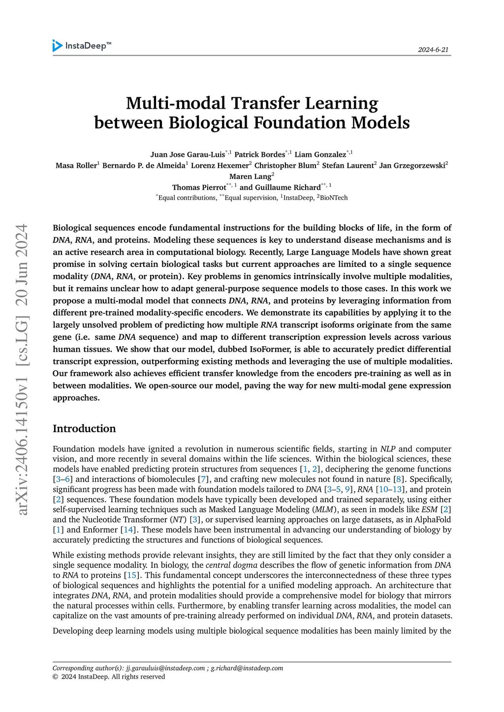Biological sequences encode fundamental instructions for the building blocks of life, in the form of DNA, RNA, and proteins. Modeling these sequences is key to understand disease mechanisms and is an active research area in computational biology. Recently, Large Language Models have shown great promise in solving certain biological tasks but current approaches are limited to a single sequence modality (DNA, RNA, or protein). Key problems in genomics intrinsically involve multiple modalities, but it remains unclear how to adapt general-purpose sequence models to those cases. In this work we propose a multi-modal model that connects DNA, RNA, and proteins by leveraging information from different pre-trained modality-specific encoders. We demonstrate its capabilities by applying it to the largely unsolved problem of predicting how multiple RNA transcript isoforms originate from the same gene (i.e. same DNA sequence) and map to different transcription expression levels across various human tissues. We show that our model, dubbed IsoFormer, is able to accurately predict differential transcript expression, outperforming existing methods and leveraging the use of multiple modalities. Our framework also achieves efficient transfer knowledge from the encoders pre-training as well as in between modalities. We open-source our model, paving the way for new multi-modal gene expression approaches.