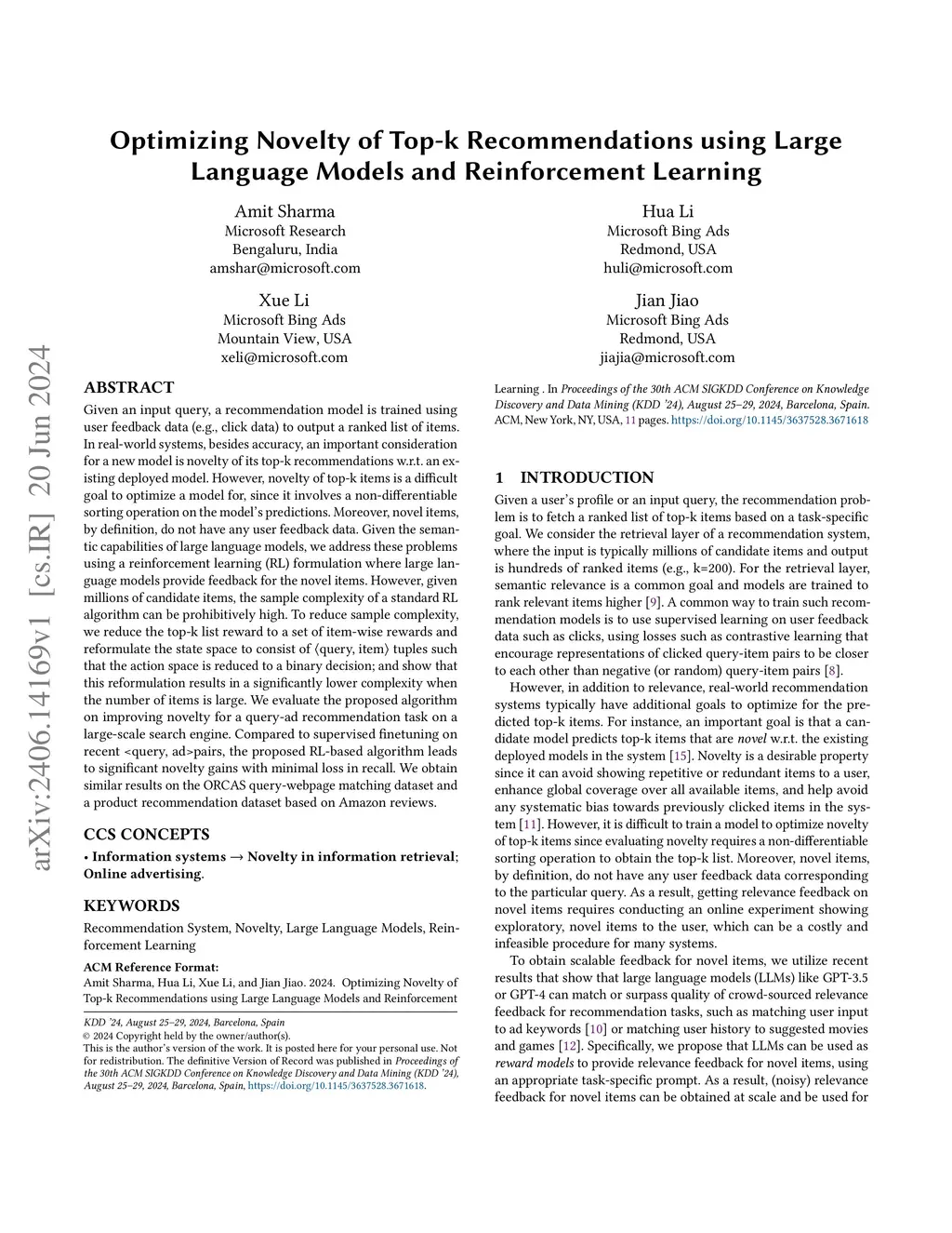 Given an input query, a recommendation model is trained using user feedback data (e.g., click data) to output a ranked list of items. In real-world systems, besides accuracy, an important consideration for a new model is novelty of its top-k recommendations w.r.t. an existing deployed model. However, novelty of top-k items is a difficult goal to optimize a model for, since it involves a non-differentiable sorting operation on the model's predictions. Moreover, novel items, by definition, do not have any user feedback data. Given the semantic capabilities of large language models, we address these problems using a reinforcement learning (RL) formulation where large language models provide feedback for the novel items. However, given millions of candidate items, the sample complexity of a standard RL algorithm can be prohibitively high. To reduce sample complexity, we reduce the top-k list reward to a set of item-wise rewards and reformulate the state space to consist of <query, item> tuples such that the action space is reduced to a binary decision; and show that this reformulation results in a significantly lower complexity when the number of items is large. We evaluate the proposed algorithm on improving novelty for a query-ad recommendation task on a large-scale search engine. Compared to supervised finetuning on recent <query, ad> pairs, the proposed RL-based algorithm leads to significant novelty gains with minimal loss in recall. We obtain similar results on the ORCAS query-webpage matching dataset and a product recommendation dataset based on Amazon reviews.