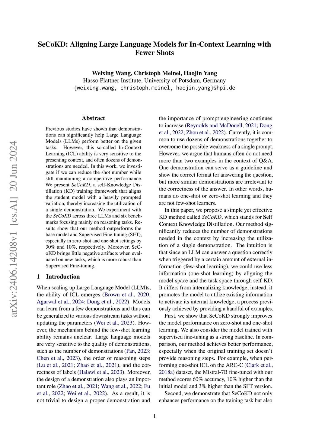Previous studies have shown that demonstrations can significantly help Large Language Models (LLMs ) perform better on the given tasks. However, this so-called In-Context Learning ( ICL ) ability is very sensitive to the presenting context, and often dozens of demonstrations are needed. In this work, we investigate if we can reduce the shot number while still maintaining a competitive performance. We present SeCoKD, a self-Knowledge Distillation ( KD ) training framework that aligns the student model with a heavily prompted variation, thereby increasing the utilization of a single demonstration. We experiment with the SeCoKD across three LLMs and six benchmarks focusing mainly on reasoning tasks. Results show that our method outperforms the base model and Supervised Fine-tuning ( SFT ), especially in zero-shot and one-shot settings by 30% and 10%, respectively. Moreover, SeCoKD brings little negative artifacts when evaluated on new tasks, which is more robust than Supervised Fine-tuning.