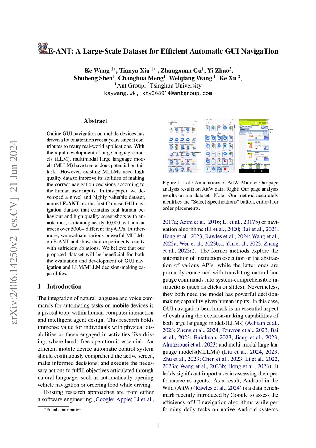 Online GUI navigation on mobile devices has driven a lot of attention recent years since it contributes to many real-world applications. With the rapid development of large language models (LLM), multimodal large language models (MLLM) have tremendous potential on this task. However, existing MLLMs need high quality data to improve its abilities of making the correct navigation decisions according to the human user inputs. In this paper, we developed a novel and highly valuable dataset, named \textbf{E-ANT}, as the first Chinese GUI navigation dataset that contains real human behaviour and high quality screenshots with annotations, containing nearly 40,000 real human traces over 5000+ different tinyAPPs. Furthermore, we evaluate various powerful MLLMs on E-ANT and show their experiments results with sufficient ablations. We believe that our proposed dataset will be beneficial for both the evaluation and development of GUI navigation and LLM/MLLM decision-making capabilities.