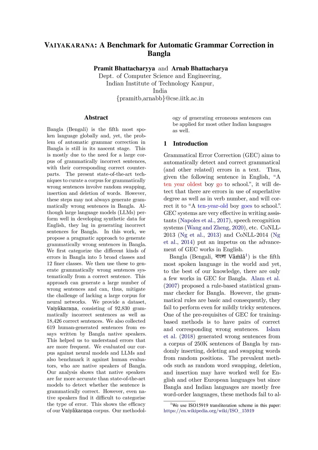 Large Language Models (LLMs) perform exceedingly well in Natural Language Understanding (NLU) tasks for many languages including English. However, despite being the fifth most-spoken language globally, Grammatical Error Correction (GEC) in Bangla remains underdeveloped. In this work, we investigate how LLMs can be leveraged for improving Bangla GEC. For that, we first do an extensive categorization of 12 error classes in Bangla, and take a survey of native Bangla speakers to collect real-world errors. We next devise a rule-based noise injection method to create grammatically incorrect sentences corresponding to correct ones. The Vaiyakarana dataset, thus created, consists of 5,67,422 sentences of which 2,27,119 are erroneous. This dataset is then used to instruction-tune LLMs for the task of GEC in Bangla. Evaluations show that instruction-tuning with \name improves GEC performance of LLMs by 3-7 percentage points as compared to the zero-shot setting, and makes them achieve human-like performance in grammatical error identification. Humans, though, remain superior in error correction.