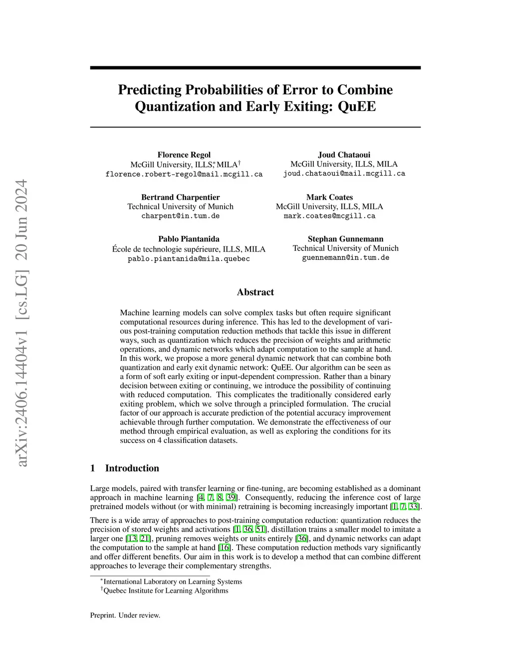 Machine learning models can solve complex tasks but often require significant computational resources during inference. This has led to the development of various post-training computation reduction methods that tackle this issue in different ways, such as quantization which reduces the precision of weights and arithmetic operations, and dynamic networks which adapt computation to the sample at hand. In this work, we propose a more general dynamic network that can combine both quantization and early exit dynamic network: QuEE. Our algorithm can be seen as a form of soft early exiting or input-dependent compression. Rather than a binary decision between exiting or continuing, we introduce the possibility of continuing with reduced computation. This complicates the traditionally considered early exiting problem, which we solve through a principled formulation. The crucial factor of our approach is accurate prediction of the potential accuracy improvement achievable through further computation. We demonstrate the effectiveness of our method through empirical evaluation, as well as exploring the conditions for its success on 4 classification datasets.