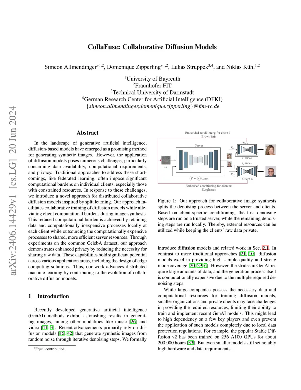 In the landscape of generative artificial intelligence, diffusion-based models have emerged as a promising method for generating synthetic images. However, the application of diffusion models poses numerous challenges, particularly concerning data availability, computational requirements, and privacy. Traditional approaches to address these shortcomings, like federated learning, often impose significant computational burdens on individual clients, especially those with constrained resources. In response to these challenges, we introduce a novel approach for distributed collaborative diffusion models inspired by split learning. Our approach facilitates collaborative training of diffusion models while alleviating client computational burdens during image synthesis. This reduced computational burden is achieved by retaining data and computationally inexpensive processes locally at each client while outsourcing the computationally expensive processes to shared, more efficient server resources. Through experiments on the common CelebA dataset, our approach demonstrates enhanced privacy by reducing the necessity for sharing raw data. These capabilities hold significant potential across various application areas, including the design of edge computing solutions. Thus, our work advances distributed machine learning by contributing to the evolution of collaborative diffusion models.