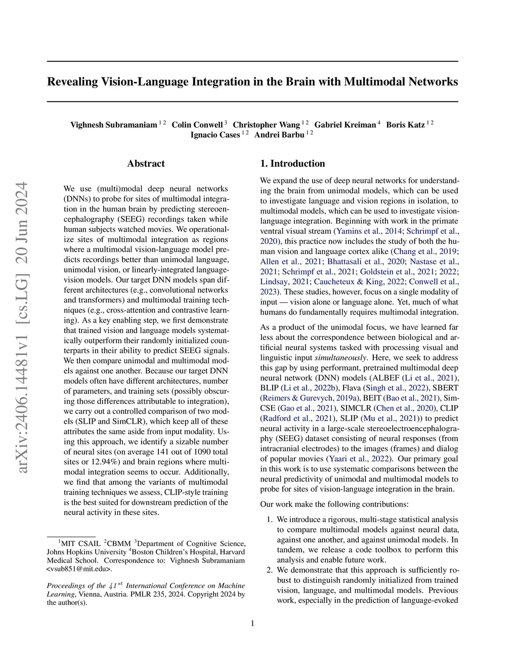 We use (multi)modal deep neural networks (DNNs) to probe for sites of multimodal integration in the human brain by predicting stereoencephalography (SEEG) recordings taken while human subjects watched movies. We operationalize sites of multimodal integration as regions where a multimodal vision-language model predicts recordings better than unimodal language, unimodal vision, or linearly-integrated language-vision models. Our target DNN models span different architectures (e.g., convolutional networks and transformers) and multimodal training techniques (e.g., cross-attention and contrastive learning). As a key enabling step, we first demonstrate that trained vision and language models systematically outperform their randomly initialized counterparts in their ability to predict SEEG signals. We then compare unimodal and multimodal models against one another. Because our target DNN models often have different architectures, number of parameters, and training sets (possibly obscuring those differences attributable to integration), we carry out a controlled comparison of two models (SLIP and SimCLR), which keep all of these attributes the same aside from input modality. Using this approach, we identify a sizable number of neural sites (on average 141 out of 1090 total sites or 12.94%) and brain regions where multimodal integration seems to occur. Additionally, we find that among the variants of multimodal training techniques we assess, CLIP-style training is the best suited for downstream prediction of the neural activity in these sites.