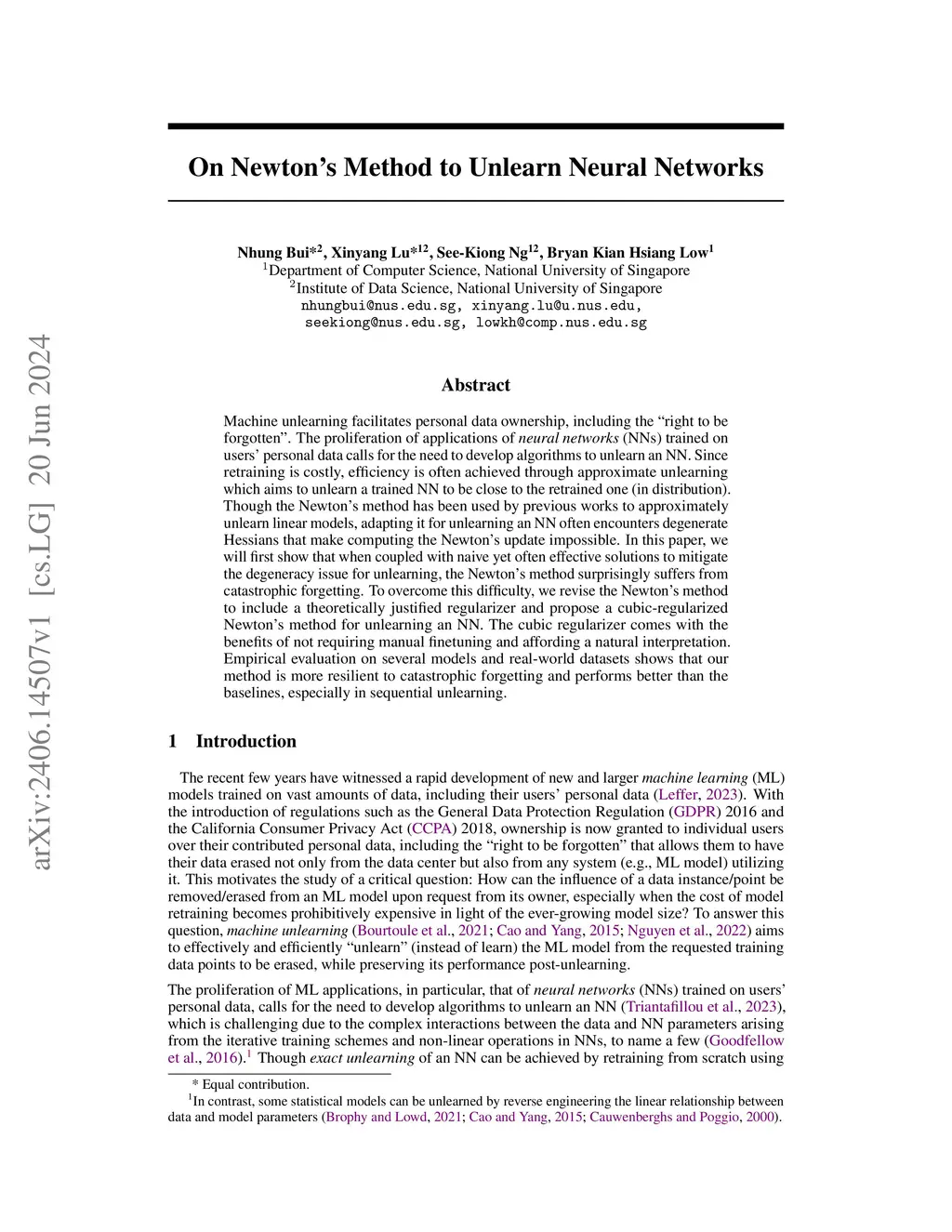 With the widespread applications of neural networks (NNs) trained on personal data, machine unlearning has become increasingly important for enabling individuals to exercise their personal data ownership, particularly the "right to be forgotten" from trained NNs. Since retraining is computationally expensive, we seek approximate unlearning algorithms for NNs that return identical models to the retrained oracle. While Newton's method has been successfully used to approximately unlearn linear models, we observe that adapting it for NN is challenging due to degenerate Hessians that make computing Newton's update impossible. Additionally, we show that when coupled with popular techniques to resolve the degeneracy, Newton's method often incurs offensively large norm updates and empirically degrades model performance post-unlearning. To address these challenges, we propose CureNewton's method, a principle approach that leverages cubic regularization to handle the Hessian degeneracy effectively. The added regularizer eliminates the need for manual finetuning and affords a natural interpretation within the unlearning context. Experiments across different models and datasets show that our method can achieve competitive unlearning performance to the state-of-the-art algorithm in practical unlearning settings, while being theoretically justified and efficient in running time.