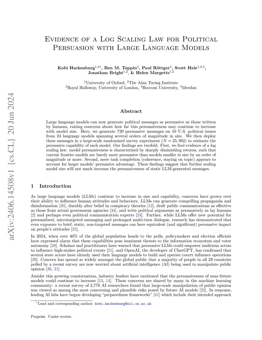 Evidence of a log scaling law for political persuasion with large