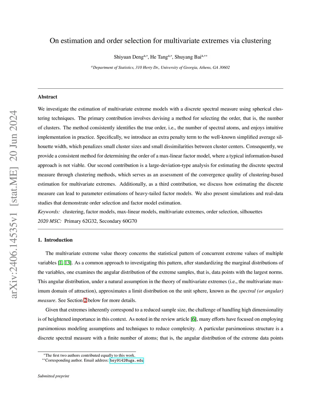 We investigate the estimation of multivariate extreme models with a discrete spectral measure using spherical clustering techniques. The primary contribution involves devising a method for selecting the order, that is, the number of clusters. The method consistently identifies the true order, i.e., the number of spectral atoms, and enjoys intuitive implementation in practice. Specifically, we introduce an extra penalty term to the well-known simplified average silhouette width, which penalizes small cluster sizes and small dissimilarities between cluster centers. Consequently, we provide a consistent method for determining the order of a max-linear factor model, where a typical information-based approach is not viable. Our second contribution is a large-deviation-type analysis for estimating the discrete spectral measure through clustering methods, which serves as an assessment of the convergence quality of clustering-based estimation for multivariate extremes. Additionally, as a third contribution, we discuss how estimating the discrete measure can lead to parameter estimations of heavy-tailed factor models. We also present simulations and real-data studies that demonstrate order selection and factor model estimation.