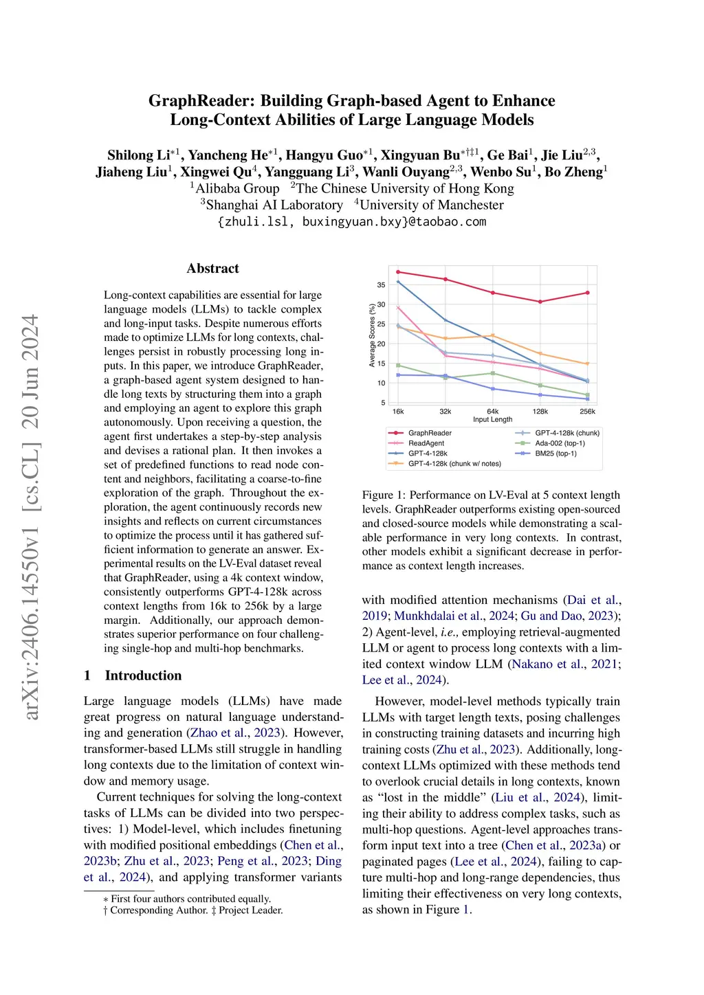 Long-context capabilities are essential for large language models (LLMs) to tackle complex and long-input tasks. Despite numerous efforts made to optimize LLMs for long contexts, challenges persist in robustly processing long inputs. In this paper, we introduce GraphReader, a graph-based agent system designed to handle long texts by structuring them into a graph and employing an agent to explore this graph autonomously. Upon receiving a question, the agent first undertakes a step-by-step analysis and devises a rational plan. It then invokes a set of predefined functions to read node content and neighbors, facilitating a coarse-to-fine exploration of the graph. Throughout the exploration, the agent continuously records new insights and reflects on current circumstances to optimize the process until it has gathered sufficient information to generate an answer. Experimental results on the LV-Eval dataset reveal that GraphReader, using a 4k context window, consistently outperforms GPT-4-128k across context lengths from 16k to 256k by a large margin. Additionally, our approach demonstrates superior performance on four challenging single-hop and multi-hop benchmarks.