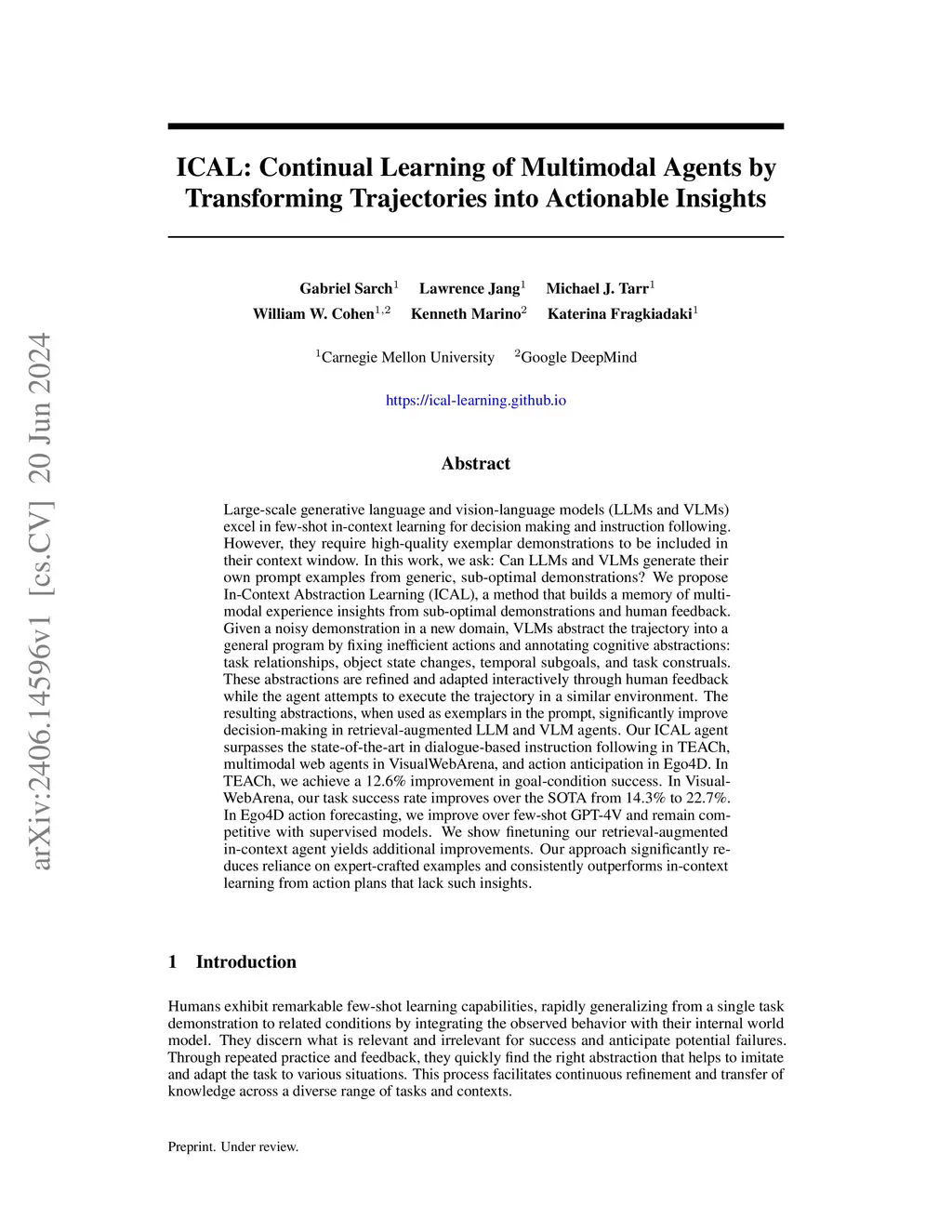 Large-scale LLMs and VLMs excel at few-shot learning but require high-quality examples. We introduce In-Context Abstraction Learning (ICAL), which iteratively refines suboptimal trajectories into high-quality data with optimized actions and detailed reasoning. Given an inefficient demonstration, a VLM corrects actions and annotates causal relationships, object states, subgoals, and task-relevant visuals, forming "programs of thought." With human feedback, these programs are improved as the agent executes them in a similar environment. The resulting examples, used as prompt context or fine-tuning data, significantly boost decision-making while reducing human feedback needs. ICAL surpasses state-of-the-art in TEACh (dialogue-based instruction following), VisualWebArena (multimodal web agents), and Ego4D (egocentric video action anticipation). In TEACh, combining fine-tuning and retrieval on ICAL examples outperforms raw human demonstrations and expert examples, achieving a 17.5% increase in goal-condition success. In VisualWebArena, retrieval-augmented GPT-4V with ICAL improves task success rate 1.6x over GPT-4V, while fine-tuning Qwen2-VL achieves a 2.8x improvement. In Ego4D, ICAL outperforms few-shot GPT-4V and remains competitive with supervised models. Overall, ICAL scales 2x better than raw human demonstrations and reduces manual prompt engineering.