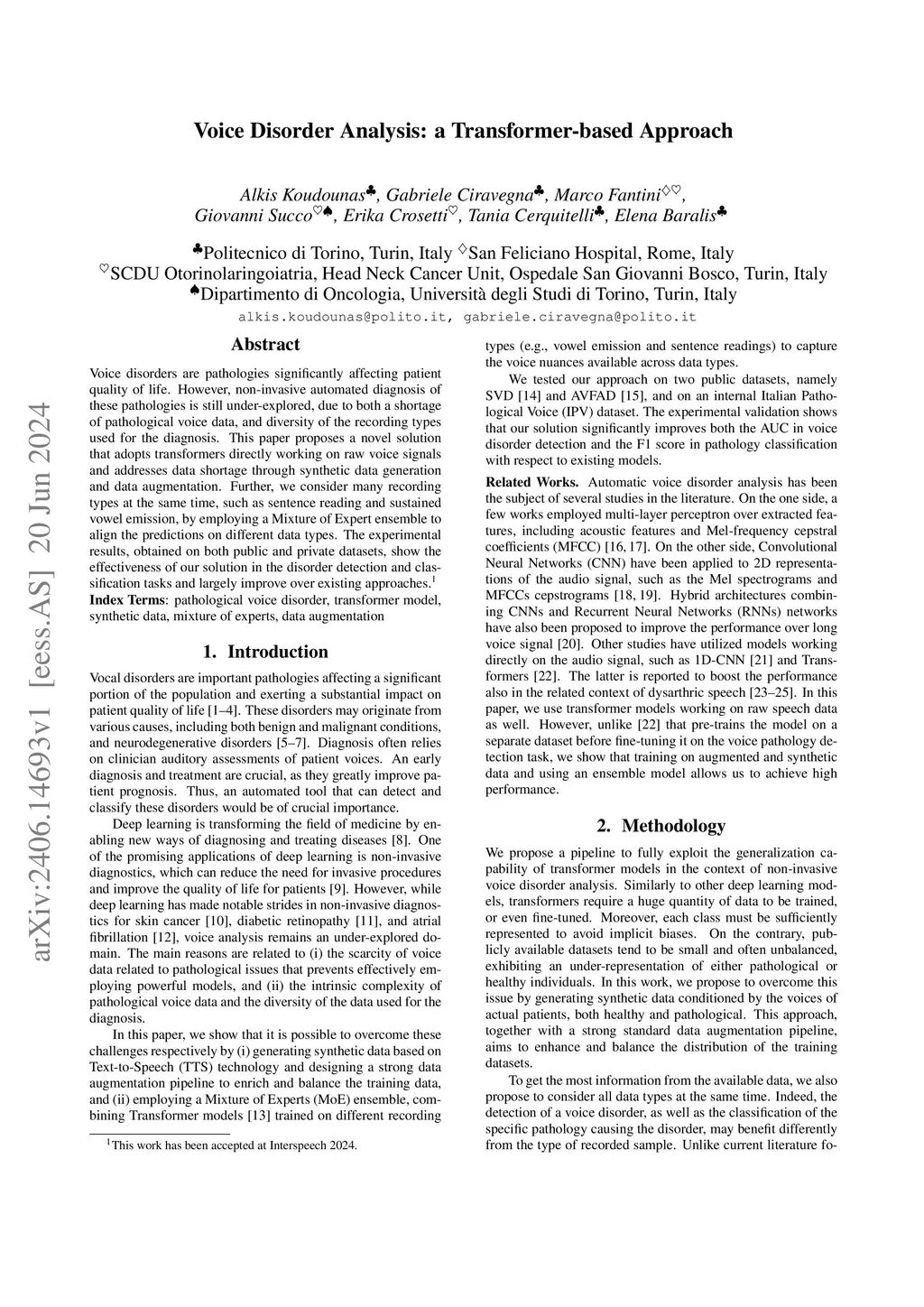 Voice disorders are pathologies significantly affecting patient quality of life. However, non-invasive automated diagnosis of these pathologies is still under-explored, due to both a shortage of pathological voice data, and diversity of the recording types used for the diagnosis. This paper proposes a novel solution that adopts transformers directly working on raw voice signals and addresses data shortage through synthetic data generation and data augmentation. Further, we consider many recording types at the same time, such as sentence reading and sustained vowel emission, by employing a Mixture of Expert ensemble to align the predictions on different data types. The experimental results, obtained on both public and private datasets, show the effectiveness of our solution in the disorder detection and classification tasks and largely improve over existing approaches.