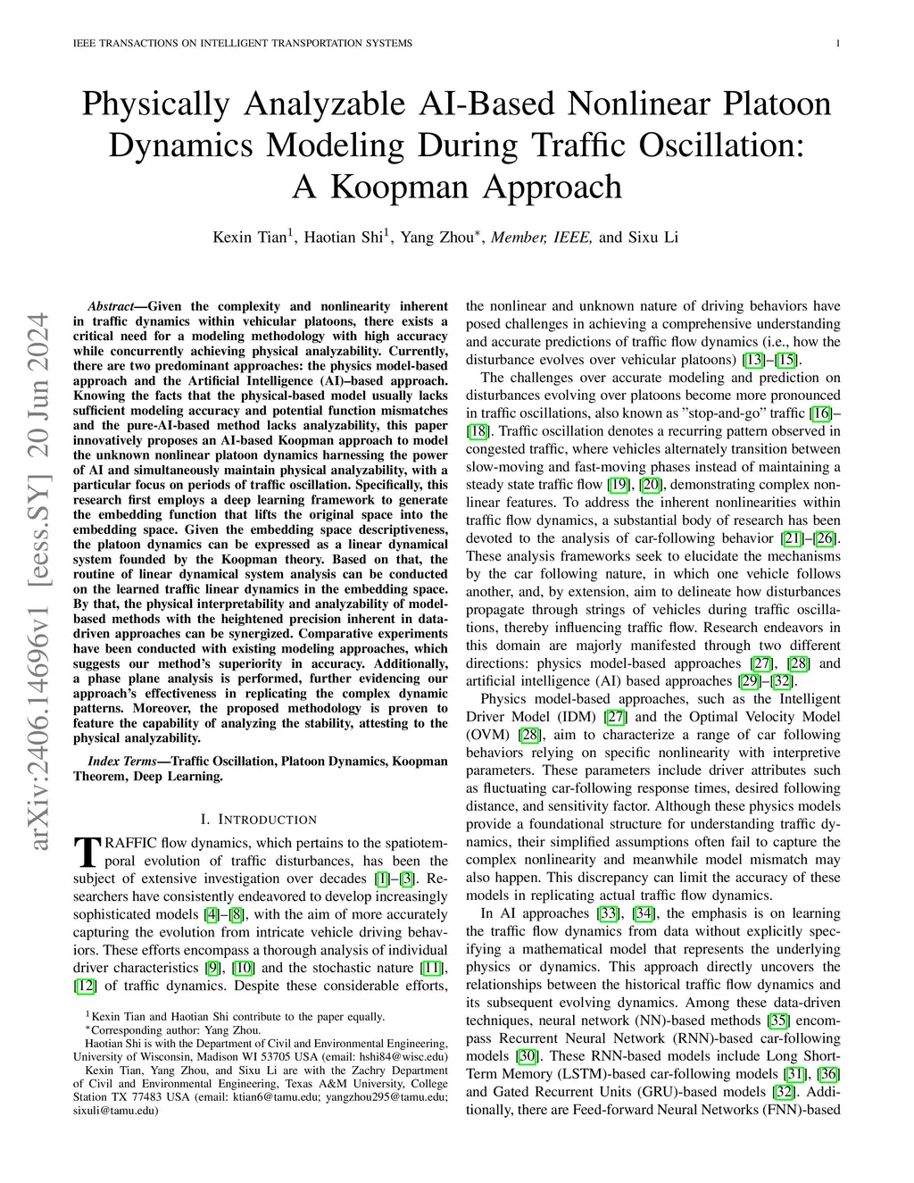 Given the complexity and nonlinearity inherent in traffic dynamics within vehicular platoons, there exists a critical need for a modeling methodology with high accuracy while concurrently achieving physical analyzability. Currently, there are two predominant approaches: the physics model-based approach and the Artificial Intelligence (AI)--based approach. Knowing the facts that the physical-based model usually lacks sufficient modeling accuracy and potential function mismatches and the pure-AI-based method lacks analyzability, this paper innovatively proposes an AI-based Koopman approach to model the unknown nonlinear platoon dynamics harnessing the power of AI and simultaneously maintain physical analyzability, with a particular focus on periods of traffic oscillation. Specifically, this research first employs a deep learning framework to generate the embedding function that lifts the original space into the embedding space. Given the embedding space descriptiveness, the platoon dynamics can be expressed as a linear dynamical system founded by the Koopman theory. Based on that, the routine of linear dynamical system analysis can be conducted on the learned traffic linear dynamics in the embedding space. By that, the physical interpretability and analyzability of model-based methods with the heightened precision inherent in data-driven approaches can be synergized. Comparative experiments have been conducted with existing modeling approaches, which suggests our method's superiority in accuracy. Additionally, a phase plane analysis is performed, further evidencing our approach's effectiveness in replicating the complex dynamic patterns. Moreover, the proposed methodology is proven to feature the capability of analyzing the stability, attesting to the physical analyzability.