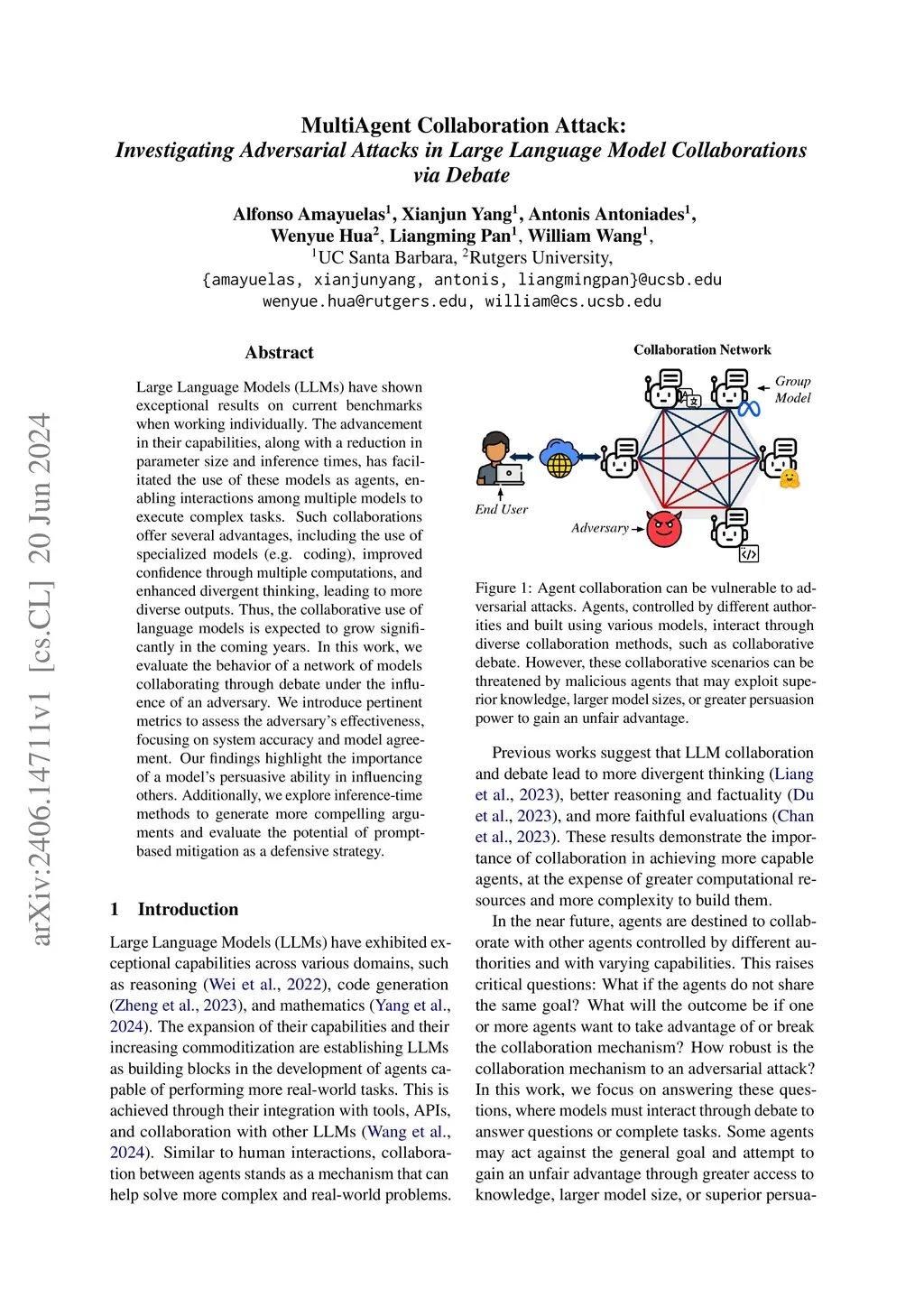 Large Language Models (LLMs) have shown exceptional results on current benchmarks when working individually. The advancement in their capabilities, along with a reduction in parameter size and inference times, has facilitated the use of these models as agents, enabling interactions among multiple models to execute complex tasks. Such collaborations offer several advantages, including the use of specialized models (e.g. coding), improved confidence through multiple computations, and enhanced divergent thinking, leading to more diverse outputs. Thus, the collaborative use of language models is expected to grow significantly in the coming years. In this work, we evaluate the behavior of a network of models collaborating through debate under the influence of an adversary. We introduce pertinent metrics to assess the adversary's effectiveness, focusing on system accuracy and model agreement. Our findings highlight the importance of a model's persuasive ability in influencing others. Additionally, we explore inference-time methods to generate more compelling arguments and evaluate the potential of prompt-based mitigation as a defensive strategy.