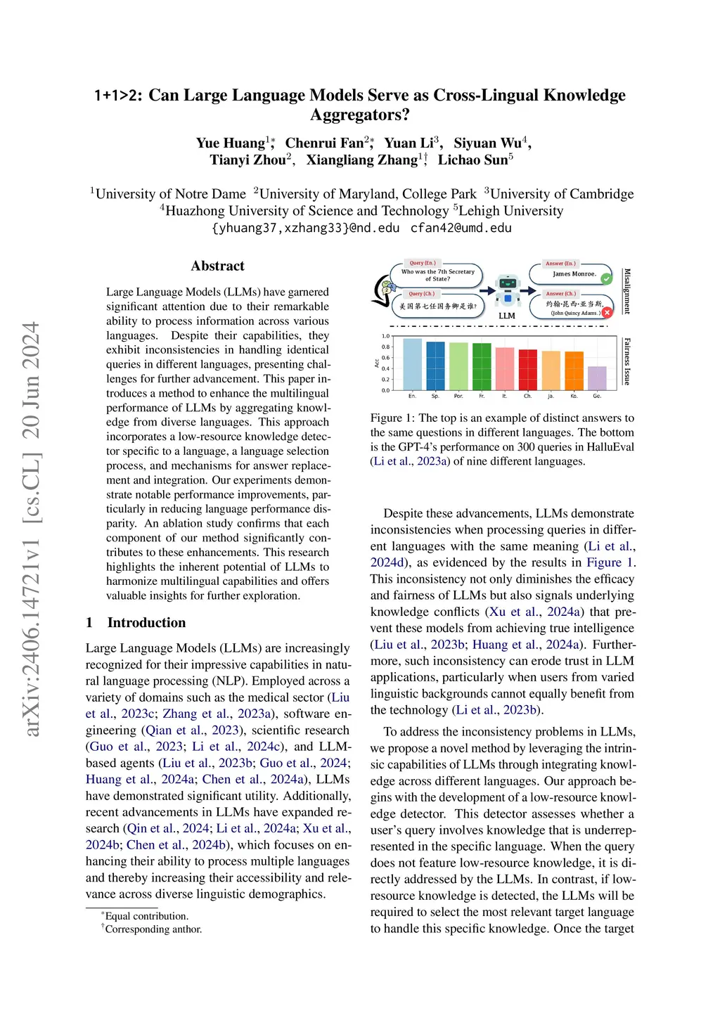 Large Language Models (LLMs) have garnered significant attention due to their remarkable ability to process information across various languages. Despite their capabilities, they exhibit inconsistencies in handling identical queries in different languages, presenting challenges for further advancement. This paper introduces a method to enhance the multilingual performance of LLMs by aggregating knowledge from diverse languages. This approach incorporates a low-resource knowledge detector specific to a language, a language selection process, and mechanisms for answer replacement and integration. Our experiments demonstrate notable performance improvements, particularly in reducing language performance disparity. An ablation study confirms that each component of our method significantly contributes to these enhancements. This research highlights the inherent potential of LLMs to harmonize multilingual capabilities and offers valuable insights for further exploration.