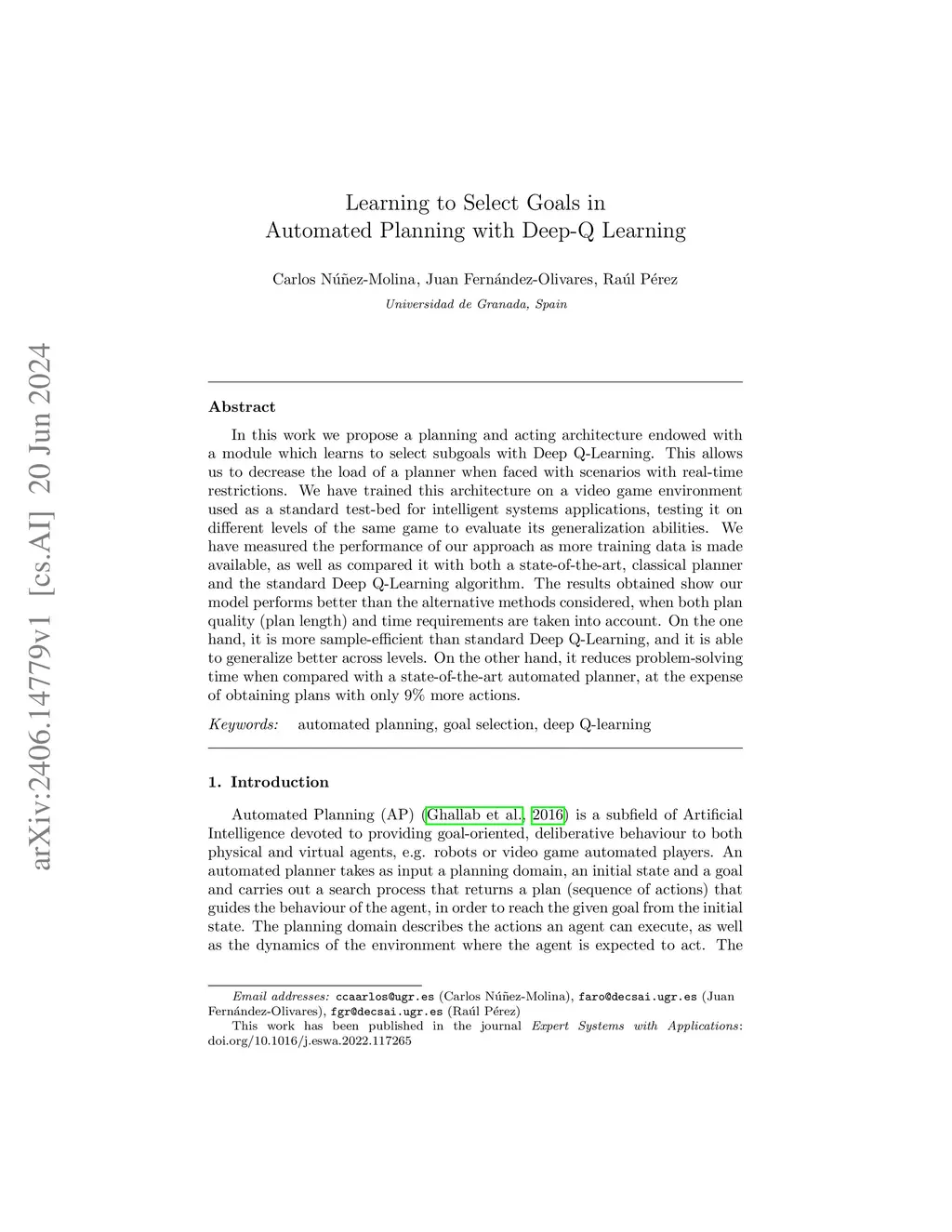 In this work we propose a planning and acting architecture endowed with a module which learns to select subgoals with Deep Q-Learning. This allows us to decrease the load of a planner when faced with scenarios with real-time restrictions. We have trained this architecture on a video game environment used as a standard test-bed for intelligent systems applications, testing it on different levels of the same game to evaluate its generalization abilities. We have measured the performance of our approach as more training data is made available, as well as compared it with both a state-of-the-art, classical planner and the standard Deep Q-Learning algorithm. The results obtained show our model performs better than the alternative methods considered, when both plan quality (plan length) and time requirements are taken into account. On the one hand, it is more sample-efficient than standard Deep Q-Learning, and it is able to generalize better across levels. On the other hand, it reduces problem-solving time when compared with a state-of-the-art automated planner, at the expense of obtaining plans with only 9% more actions.