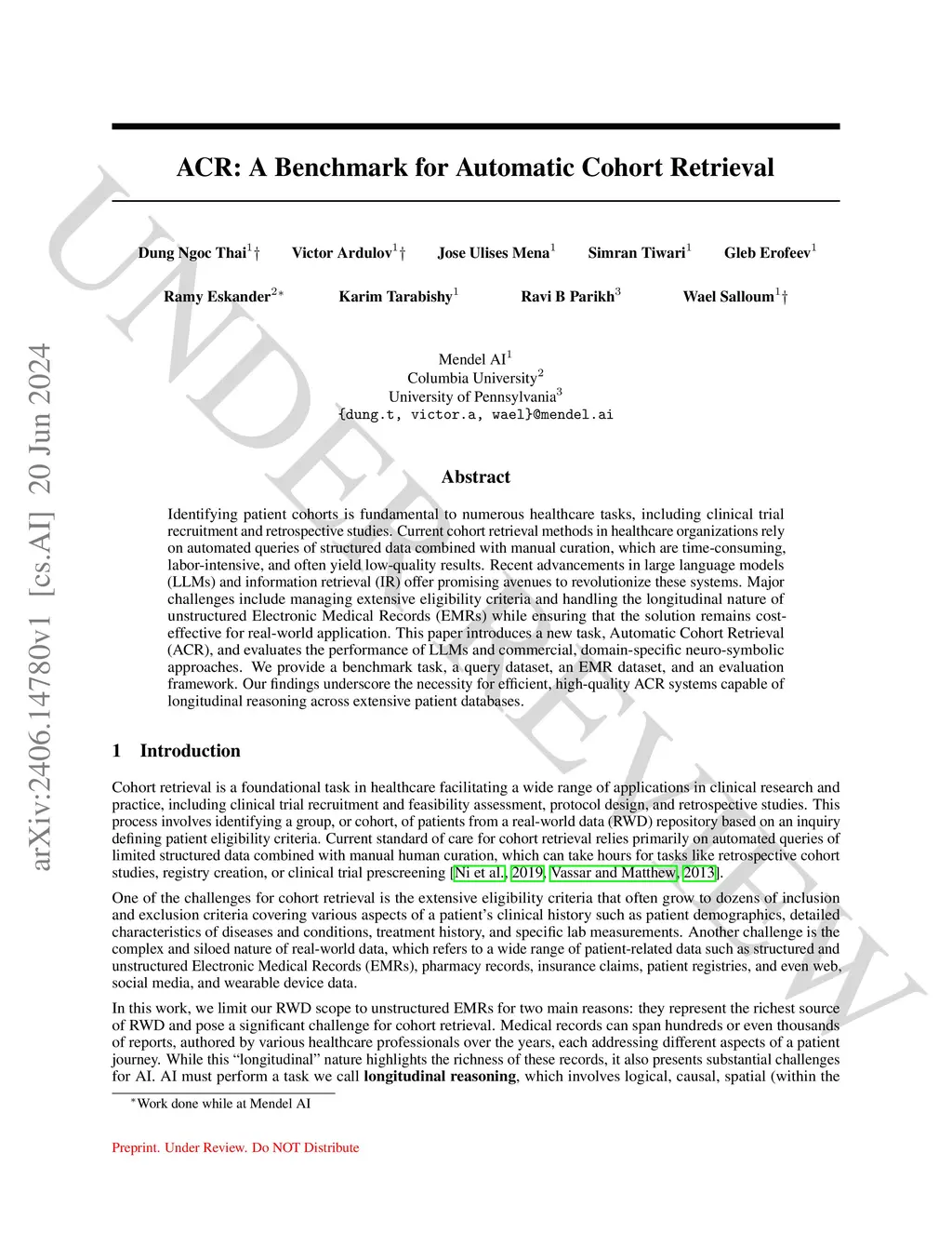 Identifying patient cohorts is fundamental to numerous healthcare tasks, including clinical trial recruitment and retrospective studies. Current cohort retrieval methods in healthcare organizations rely on automated queries of structured data combined with manual curation, which are time-consuming, labor-intensive, and often yield low-quality results. Recent advancements in large language models (LLMs) and information retrieval (IR) offer promising avenues to revolutionize these systems. Major challenges include managing extensive eligibility criteria and handling the longitudinal nature of unstructured Electronic Medical Records (EMRs) while ensuring that the solution remains cost-effective for real-world application. This paper introduces a new task, Automatic Cohort Retrieval (ACR), and evaluates the performance of LLMs and commercial, domain-specific neuro-symbolic approaches. We provide a benchmark task, a query dataset, an EMR dataset, and an evaluation framework. Our findings underscore the necessity for efficient, high-quality ACR systems capable of longitudinal reasoning across extensive patient databases.