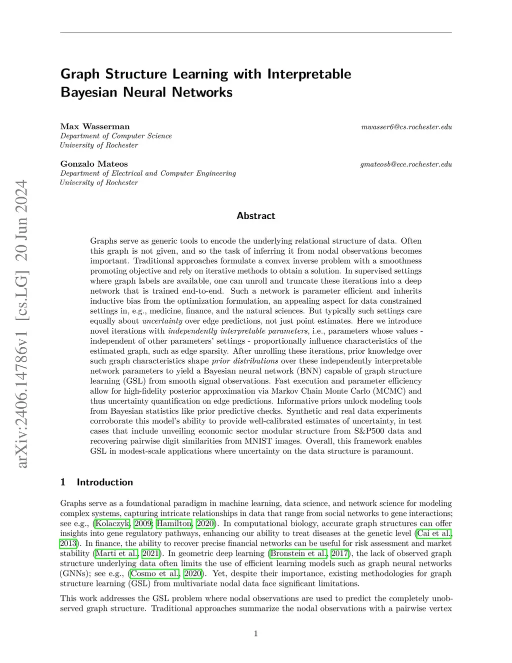 Graphs serve as generic tools to encode the underlying relational structure of data. Often this graph is not given, and so the task of inferring it from nodal observations becomes important. Traditional approaches formulate a convex inverse problem with a smoothness promoting objective and rely on iterative methods to obtain a solution. In supervised settings where graph labels are available, one can unroll and truncate these iterations into a deep network that is trained end-to-end. Such a network is parameter efficient and inherits inductive bias from the optimization formulation, an appealing aspect for data constrained settings in, e.g., medicine, finance, and the natural sciences. But typically such settings care equally about uncertainty over edge predictions, not just point estimates. Here we introduce novel iterations with independently interpretable parameters, i.e., parameters whose values - independent of other parameters' settings - proportionally influence characteristics of the estimated graph, such as edge sparsity. After unrolling these iterations, prior knowledge over such graph characteristics shape prior distributions over these independently interpretable network parameters to yield a Bayesian neural network (BNN) capable of graph structure learning (GSL) from smooth signal observations. Fast execution and parameter efficiency allow for high-fidelity posterior approximation via Markov Chain Monte Carlo (MCMC) and thus uncertainty quantification on edge predictions. Synthetic and real data experiments corroborate this model's ability to provide well-calibrated estimates of uncertainty, in test cases that include unveiling economic sector modular structure from SP data and recovering pairwise digit similarities from MNIST images. Overall, this framework enables GSL in modest-scale applications where uncertainty on the data structure is paramount.