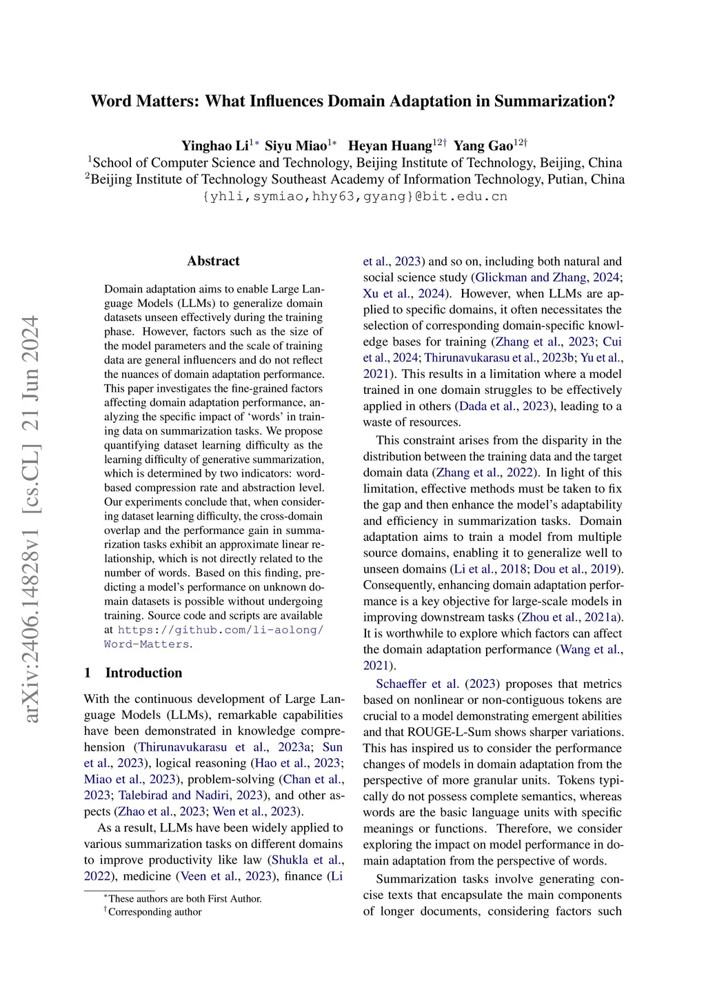 Domain adaptation aims to enable Large Language Models (LLMs) to generalize domain datasets unseen effectively during the training phase. However, factors such as the size of the model parameters and the scale of training data are general influencers and do not reflect the nuances of domain adaptation performance. This paper investigates the fine-grained factors affecting domain adaptation performance, analyzing the specific impact of `words' in training data on summarization tasks. We propose quantifying dataset learning difficulty as the learning difficulty of generative summarization, which is determined by two indicators: word-based compression rate and abstraction level. Our experiments conclude that, when considering dataset learning difficulty, the cross-domain overlap and the performance gain in summarization tasks exhibit an approximate linear relationship, which is not directly related to the number of words. Based on this finding, predicting a model's performance on unknown domain datasets is possible without undergoing training.