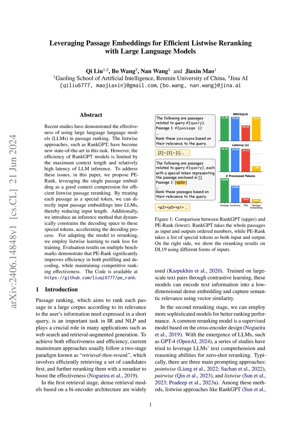 Leveraging Passage Embeddings for Efficient Listwise Reranking with Large Language Models