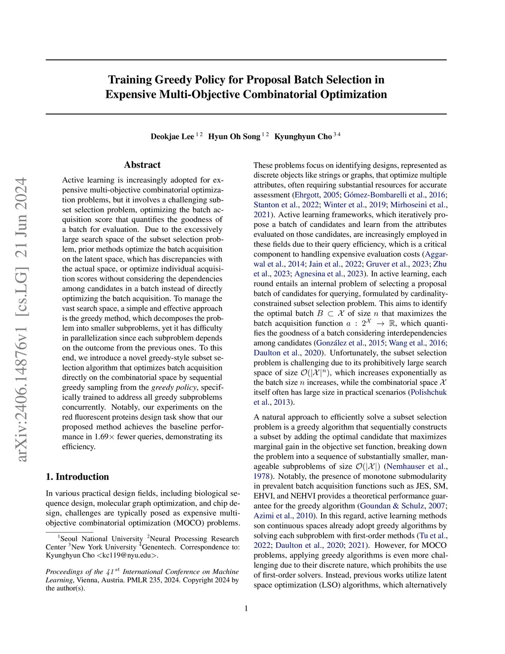 Active learning is increasingly adopted for expensive multi-objective combinatorial optimization problems, but it involves a challenging subset selection problem, optimizing the batch acquisition score that quantifies the goodness of a batch for evaluation. Due to the excessively large search space of the subset selection problem, prior methods optimize the batch acquisition on the latent space, which has discrepancies with the actual space, or optimize individual acquisition scores without considering the dependencies among candidates in a batch instead of directly optimizing the batch acquisition. To manage the vast search space, a simple and effective approach is the greedy method, which decomposes the problem into smaller subproblems, yet it has difficulty in parallelization since each subproblem depends on the outcome from the previous ones. To this end, we introduce a novel greedy-style subset selection algorithm that optimizes batch acquisition directly on the combinatorial space by sequential greedy sampling from the greedy policy, specifically trained to address all greedy subproblems concurrently. Notably, our experiments on the red fluorescent proteins design task show that our proposed method achieves the baseline performance in 1.69x fewer queries, demonstrating its efficiency.