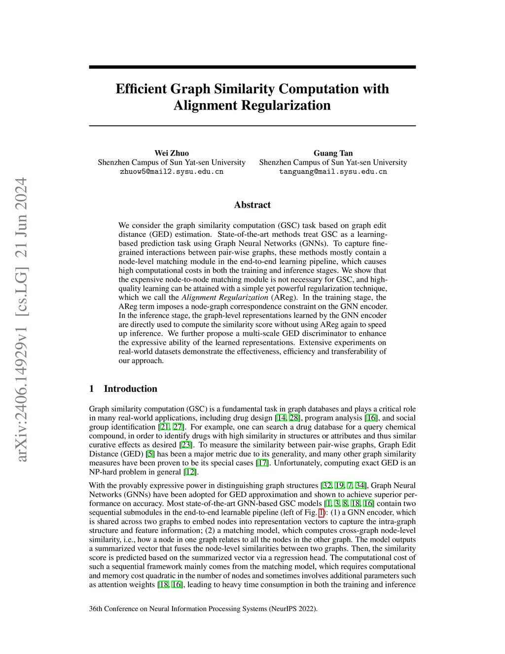 We consider the graph similarity computation (GSC) task based on graph edit distance (GED) estimation. State-of-the-art methods treat GSC as a learning-based prediction task using Graph Neural Networks (GNNs). To capture fine-grained interactions between pair-wise graphs, these methods mostly contain a node-level matching module in the end-to-end learning pipeline, which causes high computational costs in both the training and inference stages. We show that the expensive node-to-node matching module is not necessary for GSC, and high-quality learning can be attained with a simple yet powerful regularization technique, which we call the Alignment Regularization (AReg). In the training stage, the AReg term imposes a node-graph correspondence constraint on the GNN encoder. In the inference stage, the graph-level representations learned by the GNN encoder are directly used to compute the similarity score without using AReg again to speed up inference. We further propose a multi-scale GED discriminator to enhance the expressive ability of the learned representations. Extensive experiments on real-world datasets demonstrate the effectiveness, efficiency and transferability of our approach.