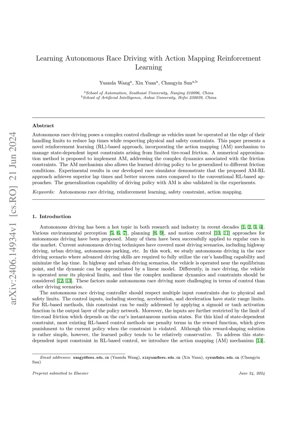 Autonomous race driving poses a complex control challenge as vehicles must be operated at the edge of their handling limits to reduce lap times while respecting physical and safety constraints. This paper presents a novel reinforcement learning (RL)-based approach, incorporating the action mapping (AM) mechanism to manage state-dependent input constraints arising from limited tire-road friction. A numerical approximation method is proposed to implement AM, addressing the complex dynamics associated with the friction constraints. The AM mechanism also allows the learned driving policy to be generalized to different friction conditions. Experimental results in our developed race simulator demonstrate that the proposed AM-RL approach achieves superior lap times and better success rates compared to the conventional RL-based approaches. The generalization capability of driving policy with AM is also validated in the experiments.