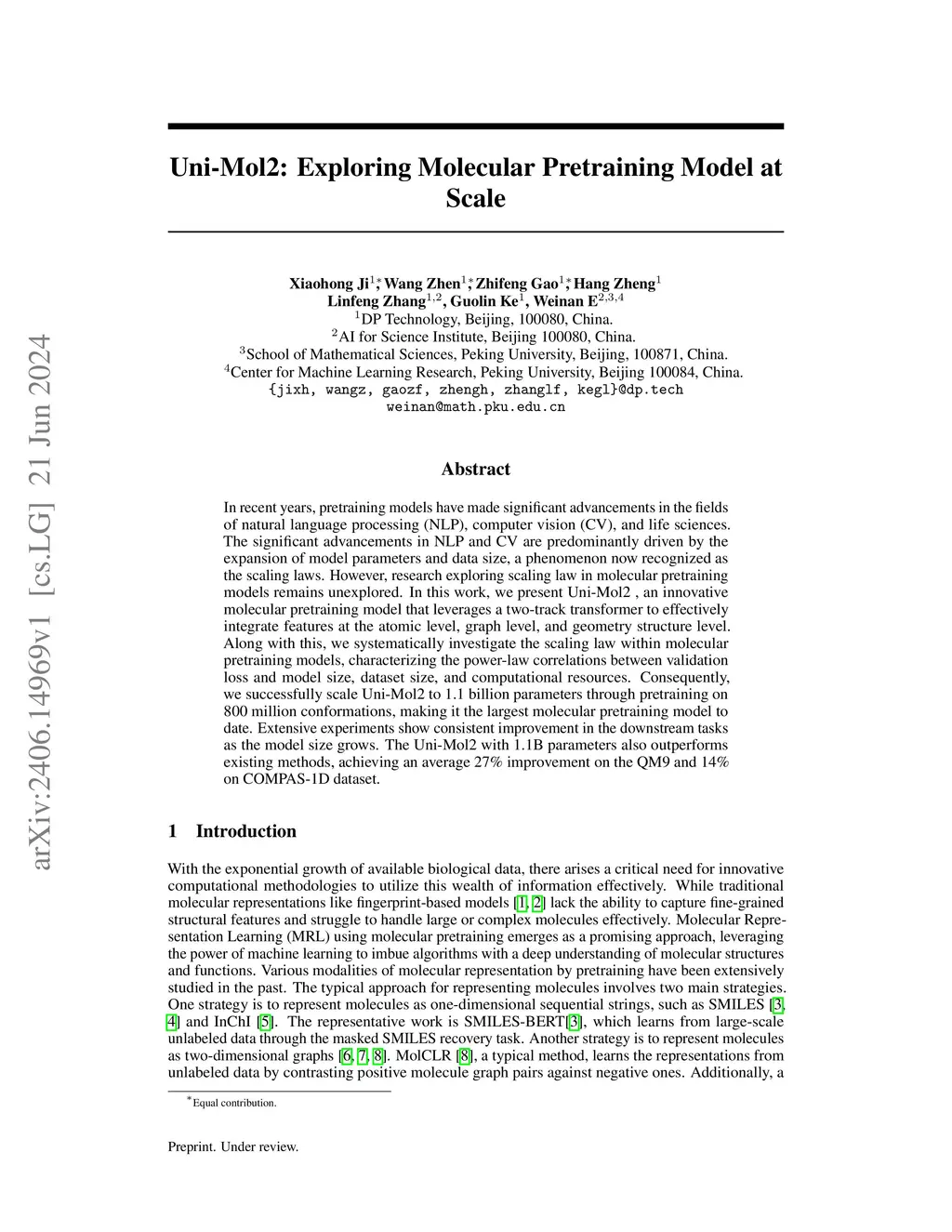 In recent years, pretraining models have made significant advancements in the fields of natural language processing (NLP), computer vision (CV), and life sciences. The significant advancements in NLP and CV are predominantly driven by the expansion of model parameters and data size, a phenomenon now recognized as the scaling laws. However, research exploring scaling law in molecular pretraining models remains unexplored. In this work, we present Uni-Mol2 , an innovative molecular pretraining model that leverages a two-track transformer to effectively integrate features at the atomic level, graph level, and geometry structure level. Along with this, we systematically investigate the scaling law within molecular pretraining models, characterizing the power-law correlations between validation loss and model size, dataset size, and computational resources. Consequently, we successfully scale Uni-Mol2 to 1.1 billion parameters through pretraining on 800 million conformations, making it the largest molecular pretraining model to date. Extensive experiments show consistent improvement in the downstream tasks as the model size grows. The Uni-Mol2 with 1.1B parameters also outperforms existing methods, achieving an average 27% improvement on the QM9 and 14% on COMPAS-1D dataset.