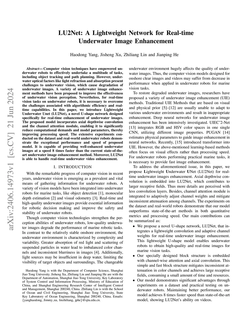 Computer vision techniques have empowered underwater robots to effectively undertake a multitude of tasks, including object tracking and path planning. However, underwater optical factors like light refraction and absorption present challenges to underwater vision, which cause degradation of underwater images. A variety of underwater image enhancement methods have been proposed to improve the effectiveness of underwater vision perception. Nevertheless, for real-time vision tasks on underwater robots, it is necessary to overcome the challenges associated with algorithmic efficiency and real-time capabilities. In this paper, we introduce Lightweight Underwater Unet (LU2Net), a novel U-shape network designed specifically for real-time enhancement of underwater images. The proposed model incorporates axial depthwise convolution and the channel attention module, enabling it to significantly reduce computational demands and model parameters, thereby improving processing speed. The extensive experiments conducted on the dataset and real-world underwater robots demonstrate the exceptional performance and speed of proposed model. It is capable of providing well-enhanced underwater images at a speed 8 times faster than the current state-of-the-art underwater image enhancement method. Moreover, LU2Net is able to handle real-time underwater video enhancement.