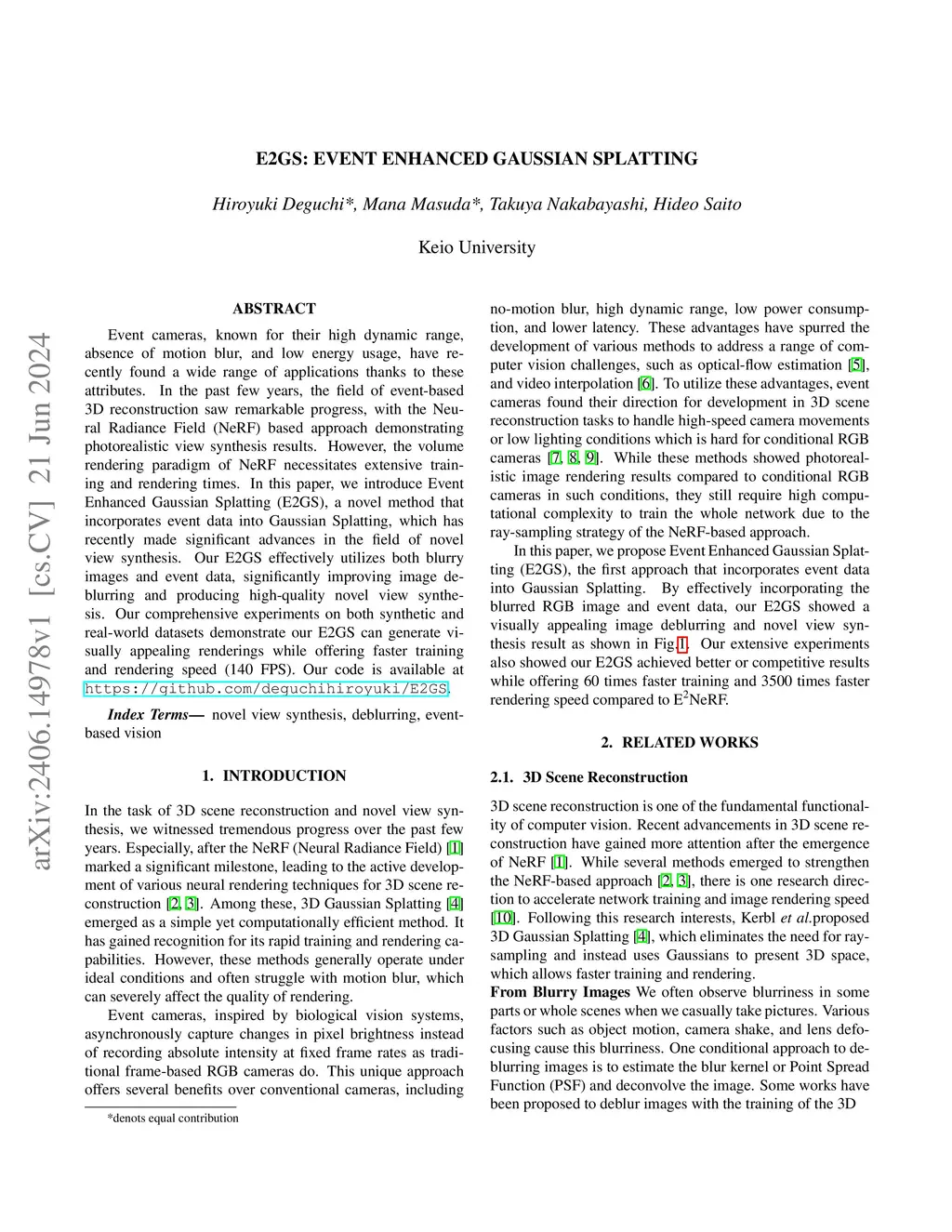 Event cameras, known for their high dynamic range, absence of motion blur, and low energy usage, have recently found a wide range of applications thanks to these attributes. In the past few years, the field of event-based 3D reconstruction saw remarkable progress, with the Neural Radiance Field (NeRF) based approach demonstrating photorealistic view synthesis results. However, the volume rendering paradigm of NeRF necessitates extensive training and rendering times. In this paper, we introduce Event Enhanced Gaussian Splatting (E2GS), a novel method that incorporates event data into Gaussian Splatting, which has recently made significant advances in the field of novel view synthesis. Our E2GS effectively utilizes both blurry images and event data, significantly improving image deblurring and producing high-quality novel view synthesis. Our comprehensive experiments on both synthetic and real-world datasets demonstrate our E2GS can generate visually appealing renderings while offering faster training and rendering speed (140 FPS). Our code is available at https://github.com/deguchihiroyuki/E2GS.