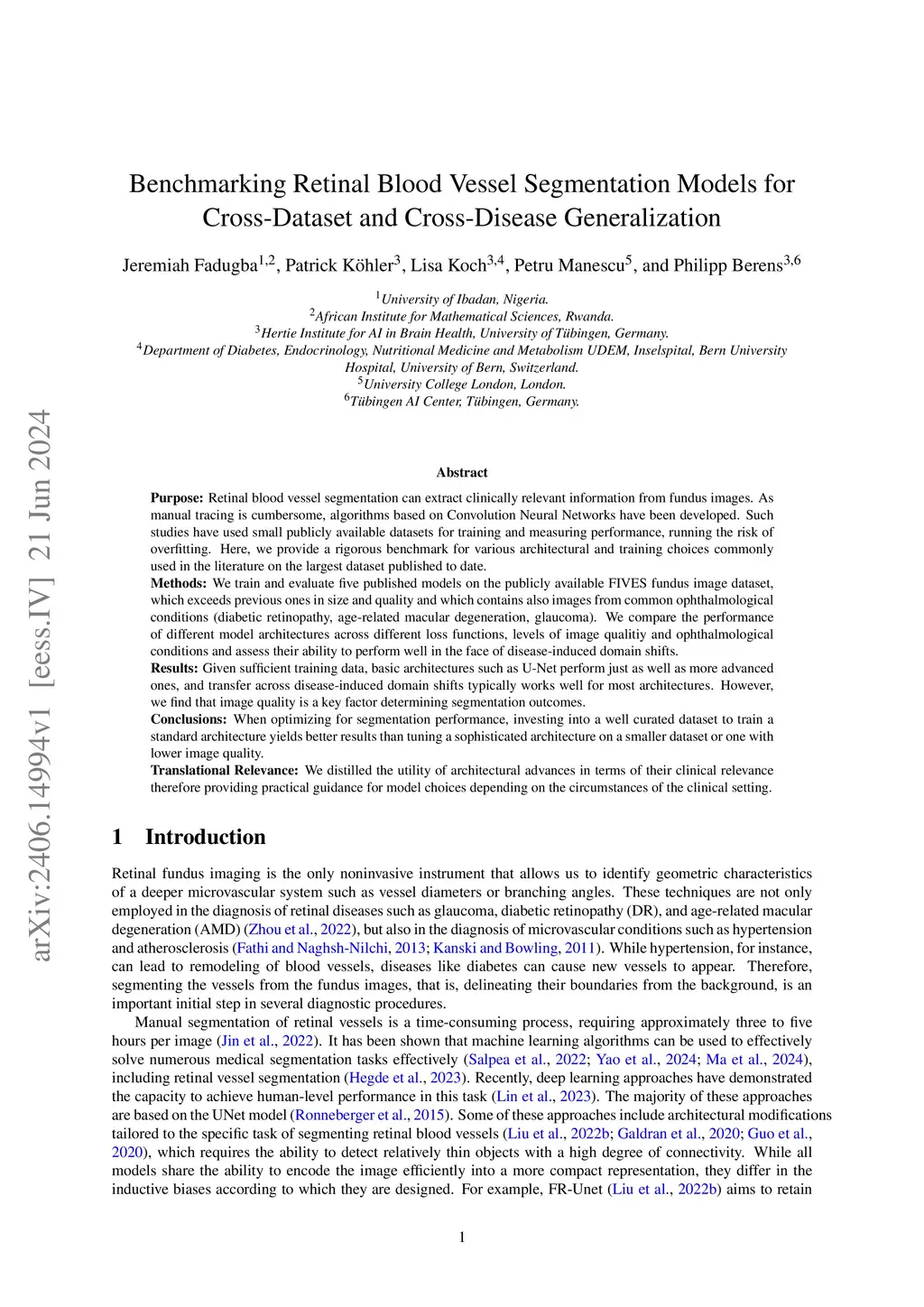 Retinal blood vessel segmentation can extract clinically relevant information from fundus images. As manual tracing is cumbersome, algorithms based on Convolution Neural Networks have been developed. Such studies have used small publicly available datasets for training and measuring performance, running the risk of overfitting. Here, we provide a rigorous benchmark for various architectural and training choices commonly used in the literature on the largest dataset published to date. We train and evaluate five published models on the publicly available FIVES fundus image dataset, which exceeds previous ones in size and quality and which contains also images from common ophthalmological conditions (diabetic retinopathy, age-related macular degeneration, glaucoma). We compare the performance of different model architectures across different loss functions, levels of image qualitiy and ophthalmological conditions and assess their ability to perform well in the face of disease-induced domain shifts. Given sufficient training data, basic architectures such as U-Net perform just as well as more advanced ones, and transfer across disease-induced domain shifts typically works well for most architectures. However, we find that image quality is a key factor determining segmentation outcomes. When optimizing for segmentation performance, investing into a well curated dataset to train a standard architecture yields better results than tuning a sophisticated architecture on a smaller dataset or one with lower image quality. We distilled the utility of architectural advances in terms of their clinical relevance therefore providing practical guidance for model choices depending on the circumstances of the clinical setting