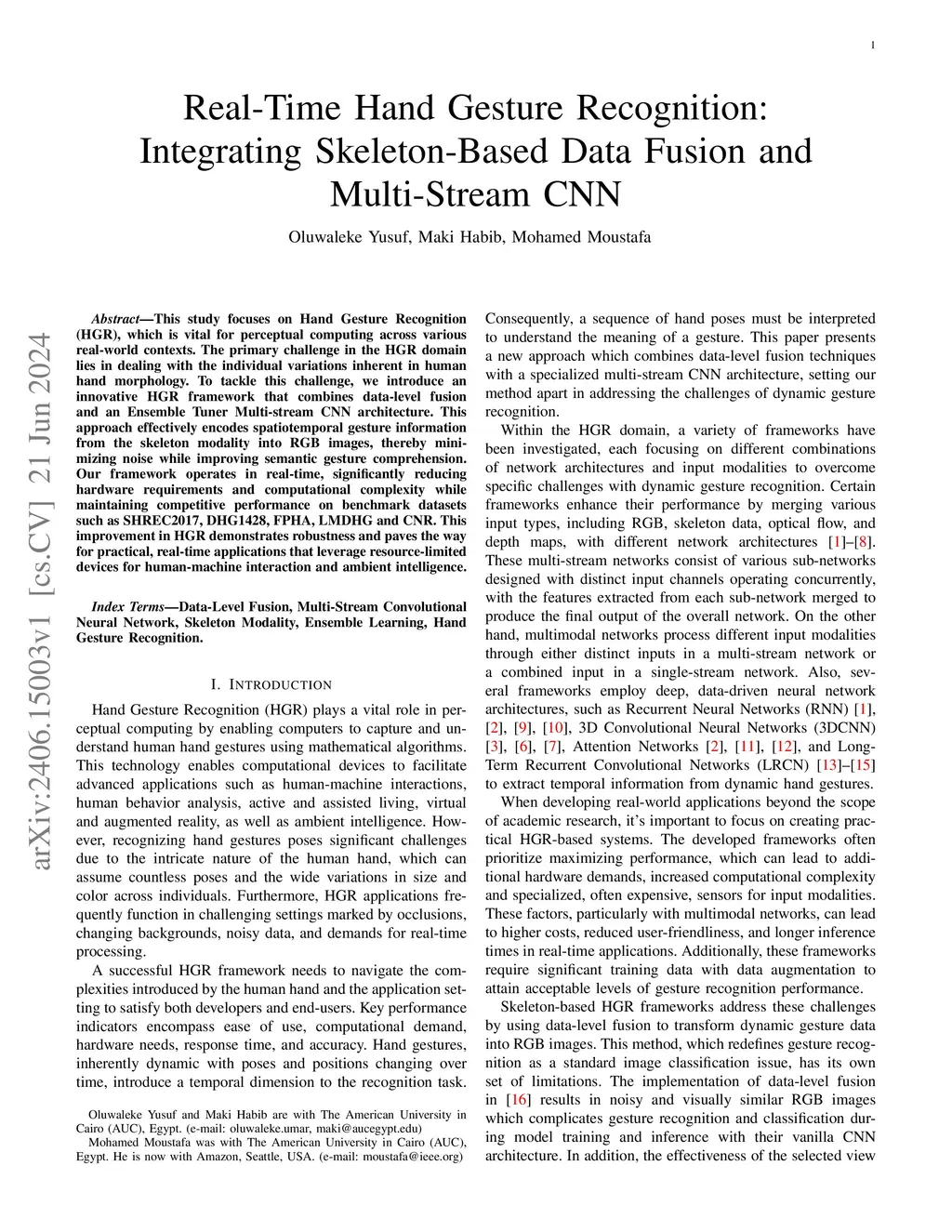 This study focuses on Hand Gesture Recognition (HGR), which is vital for perceptual computing across various real-world contexts. The primary challenge in the HGR domain lies in dealing with the individual variations inherent in human hand morphology. To tackle this challenge, we introduce an innovative HGR framework that combines data-level fusion and an Ensemble Tuner Multi-stream CNN architecture. This approach effectively encodes spatiotemporal gesture information from the skeleton modality into RGB images, thereby minimizing noise while improving semantic gesture comprehension. Our framework operates in real-time, significantly reducing hardware requirements and computational complexity while maintaining competitive performance on benchmark datasets such as SHREC2017, DHG1428, FPHA, LMDHG and CNR. This improvement in HGR demonstrates robustness and paves the way for practical, real-time applications that leverage resource-limited devices for human-machine interaction and ambient intelligence.