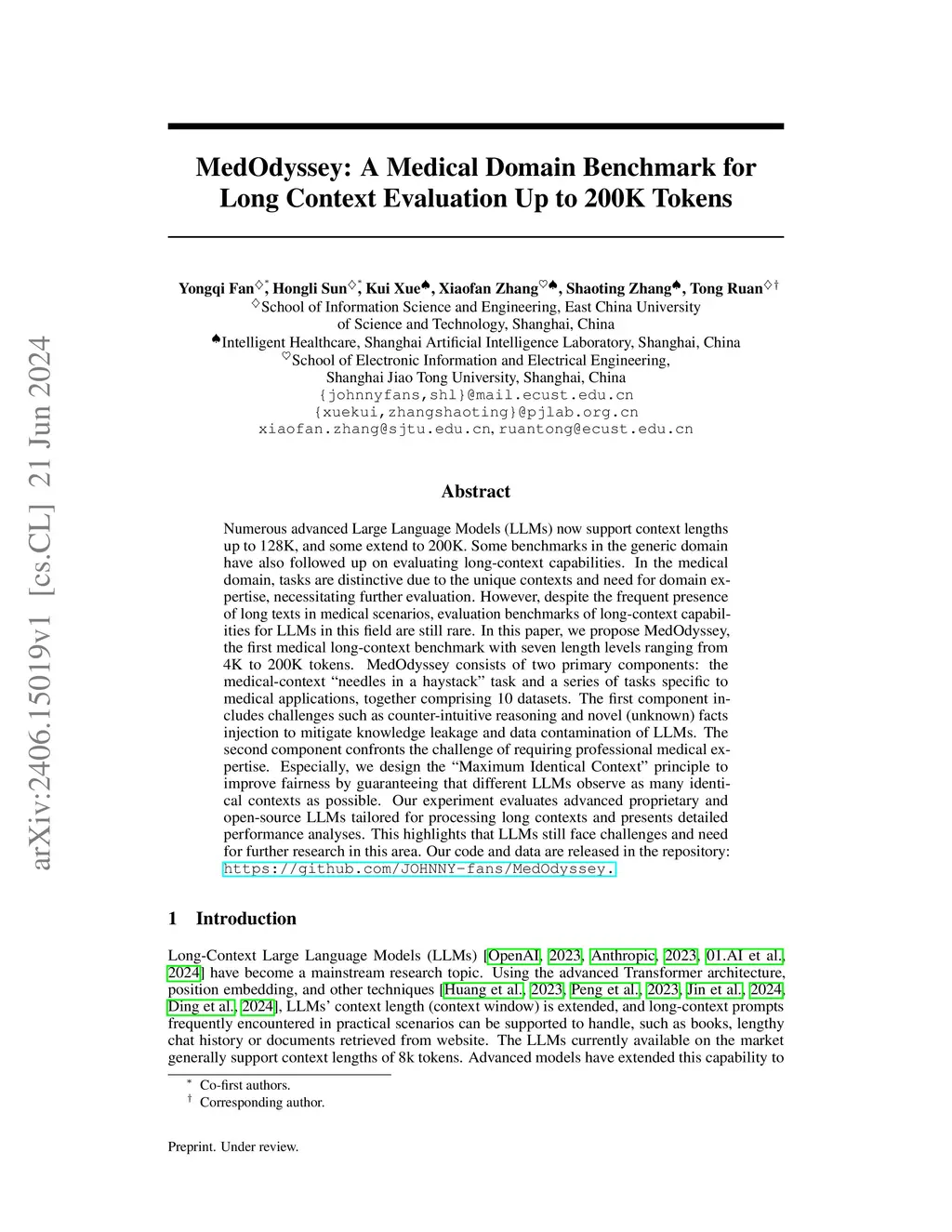 Numerous advanced Large Language Models (LLMs) now support context lengths up to 128K, and some extend to 200K. Some benchmarks in the generic domain have also followed up on evaluating long-context capabilities. In the medical domain, tasks are distinctive due to the unique contexts and need for domain expertise, necessitating further evaluation. However, despite the frequent presence of long texts in medical scenarios, evaluation benchmarks of long-context capabilities for LLMs in this field are still rare. In this paper, we propose MedOdyssey, the first medical long-context benchmark with seven length levels ranging from 4K to 200K tokens. MedOdyssey consists of two primary components: the medical-context "needles in a haystack" task and a series of tasks specific to medical applications, together comprising 10 datasets. The first component includes challenges such as counter-intuitive reasoning and novel (unknown) facts injection to mitigate knowledge leakage and data contamination of LLMs. The second component confronts the challenge of requiring professional medical expertise. Especially, we design the ``Maximum Identical Context'' principle to improve fairness by guaranteeing that different LLMs observe as many identical contexts as possible. Our experiment evaluates advanced proprietary and open-source LLMs tailored for processing long contexts and presents detailed performance analyses. This highlights that LLMs still face challenges and need for further research in this area. Our code and data are released in the repository: \url{https://github.com/JOHNNY-fans/MedOdyssey.}