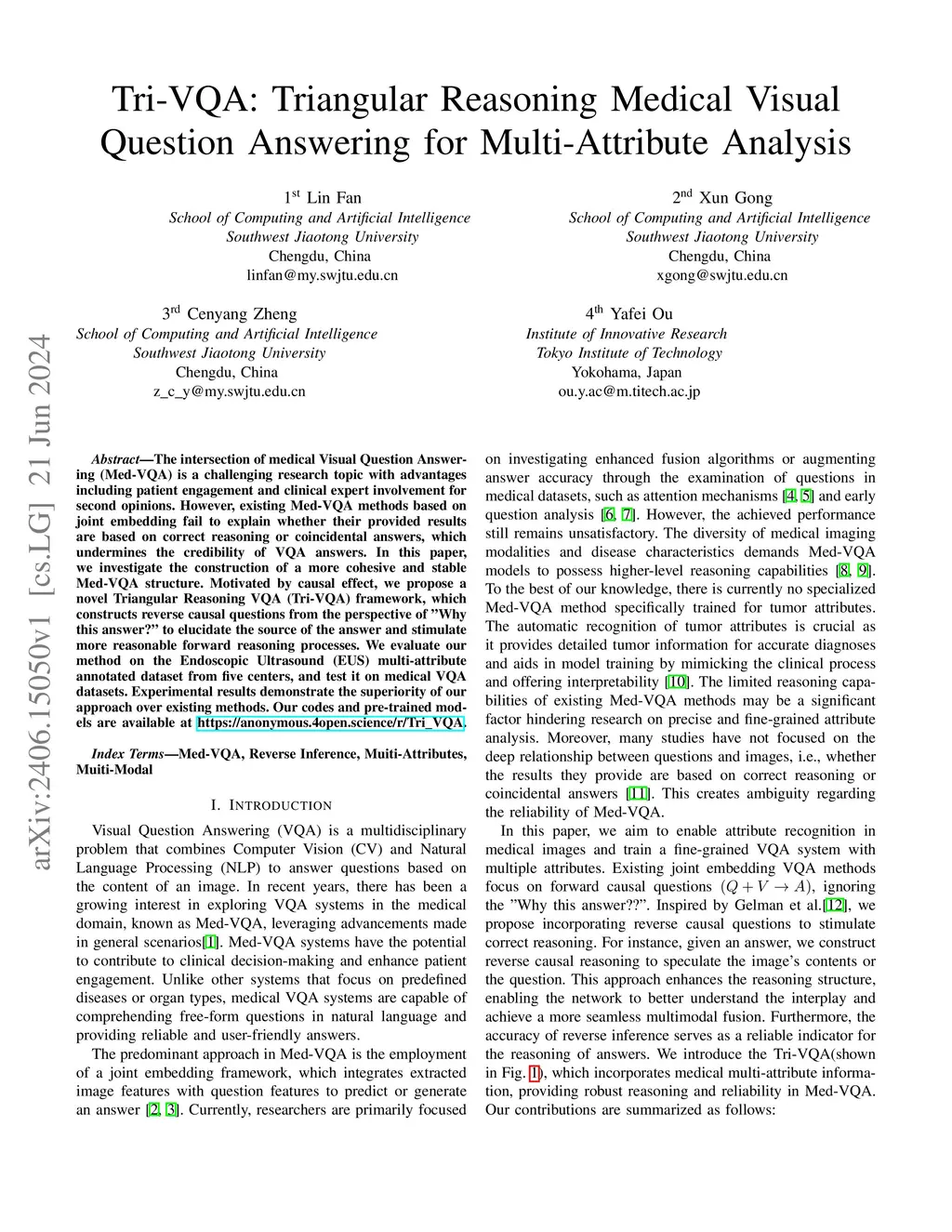 The intersection of medical Visual Question Answering (Med-VQA) is a challenging research topic with advantages including patient engagement and clinical expert involvement for second opinions. However, existing Med-VQA methods based on joint embedding fail to explain whether their provided results are based on correct reasoning or coincidental answers, which undermines the credibility of VQA answers. In this paper, we investigate the construction of a more cohesive and stable Med-VQA structure. Motivated by causal effect, we propose a novel Triangular Reasoning VQA (Tri-VQA) framework, which constructs reverse causal questions from the perspective of "Why this answer?" to elucidate the source of the answer and stimulate more reasonable forward reasoning processes. We evaluate our method on the Endoscopic Ultrasound (EUS) multi-attribute annotated dataset from five centers, and test it on medical VQA datasets. Experimental results demonstrate the superiority of our approach over existing methods. Our codes and pre-trained models are available at https://anonymous.4open.science/r/Tri_VQA.