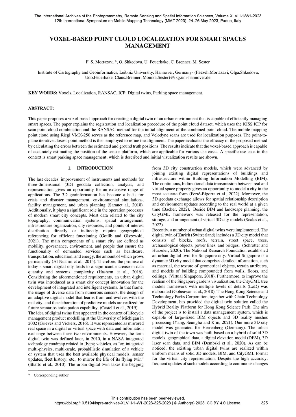 This paper proposes a voxel-based approach for creating a digital twin of an urban environment that is capable of efficiently managing smart spaces. The paper explains the registration and localization procedure of the point cloud dataset, which uses the KISS ICP for scan point cloud combination and the RANSAC method for the initial alignment of the combined point cloud. The mobile mapping point cloud using Riegl VMX-250 serves as the reference map, and Velodyne scans are used for localization purposes. The point-to-plane iterative closest-point method is then employed to refine the alignment. The paper evaluates the efficacy of the proposed method by calculating the errors between the estimated and ground truth positions. The results indicate that the voxel-based approach is capable of accurately estimating the position of the sensor platform, which are applicable for various use cases. A specific use case in the context is smart parking space management, which is described and initial visualization results are shown.
