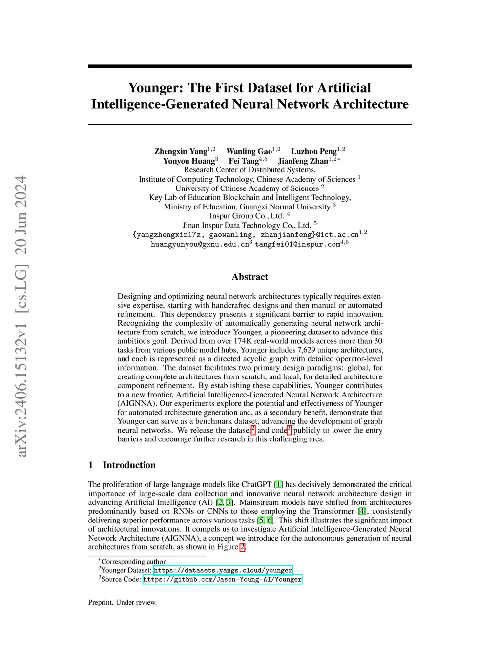 Designing and optimizing neural network architectures typically requires extensive expertise, starting with handcrafted designs and then manual or automated refinement. This dependency presents a significant barrier to rapid innovation. Recognizing the complexity of automatically generating neural network architecture from scratch, we introduce Younger, a pioneering dataset to advance this ambitious goal. Derived from over 174K real-world models across more than 30 tasks from various public model hubs, Younger includes 7,629 unique architectures, and each is represented as a directed acyclic graph with detailed operator-level information. The dataset facilitates two primary design paradigms: global, for creating complete architectures from scratch, and local, for detailed architecture component refinement. By establishing these capabilities, Younger contributes to a new frontier, Artificial Intelligence-Generated Neural Network Architecture (AIGNNA). Our experiments explore the potential and effectiveness of Younger for automated architecture generation and, as a secondary benefit, demonstrate that Younger can serve as a benchmark dataset, advancing the development of graph neural networks. We release the dataset and code publicly to lower the entry barriers and encourage further research in this challenging area.