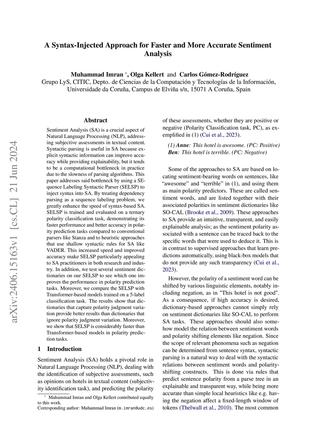Sentiment Analysis (SA) is a crucial aspect of Natural Language Processing (NLP), addressing subjective assessments in textual content. Syntactic parsing is useful in SA because explicit syntactic information can improve accuracy while providing explainability, but it tends to be a computational bottleneck in practice due to the slowness of parsing algorithms. This paper addresses said bottleneck by using a SEquence Labeling Syntactic Parser (SELSP) to inject syntax into SA. By treating dependency parsing as a sequence labeling problem, we greatly enhance the speed of syntax-based SA. SELSP is trained and evaluated on a ternary polarity classification task, demonstrating its faster performance and better accuracy in polarity prediction tasks compared to conventional parsers like Stanza and to heuristic approaches that use shallow syntactic rules for SA like VADER. This increased speed and improved accuracy make SELSP particularly appealing to SA practitioners in both research and industry. In addition, we test several sentiment dictionaries on our SELSP to see which one improves the performance in polarity prediction tasks. Moreover, we compare the SELSP with Transformer-based models trained on a 5-label classification task. The results show that dictionaries that capture polarity judgment variation provide better results than dictionaries that ignore polarity judgment variation. Moreover, we show that SELSP is considerably faster than Transformer-based models in polarity prediction tasks.