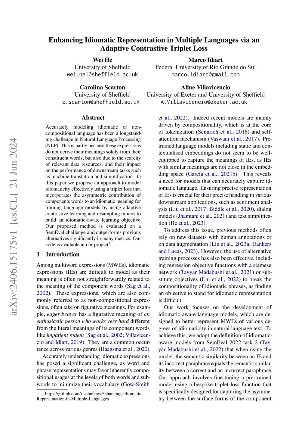 Accurately modeling idiomatic or non-compositional language has been a longstanding challenge in Natural Language Processing (NLP). This is partly because these expressions do not derive their meanings solely from their constituent words, but also due to the scarcity of relevant data resources, and their impact on the performance of downstream tasks such as machine translation and simplification. In this paper we propose an approach to model idiomaticity effectively using a triplet loss that incorporates the asymmetric contribution of components words to an idiomatic meaning for training language models by using adaptive contrastive learning and resampling miners to build an idiomatic-aware learning objective. Our proposed method is evaluated on a SemEval challenge and outperforms previous alternatives significantly in many metrics.