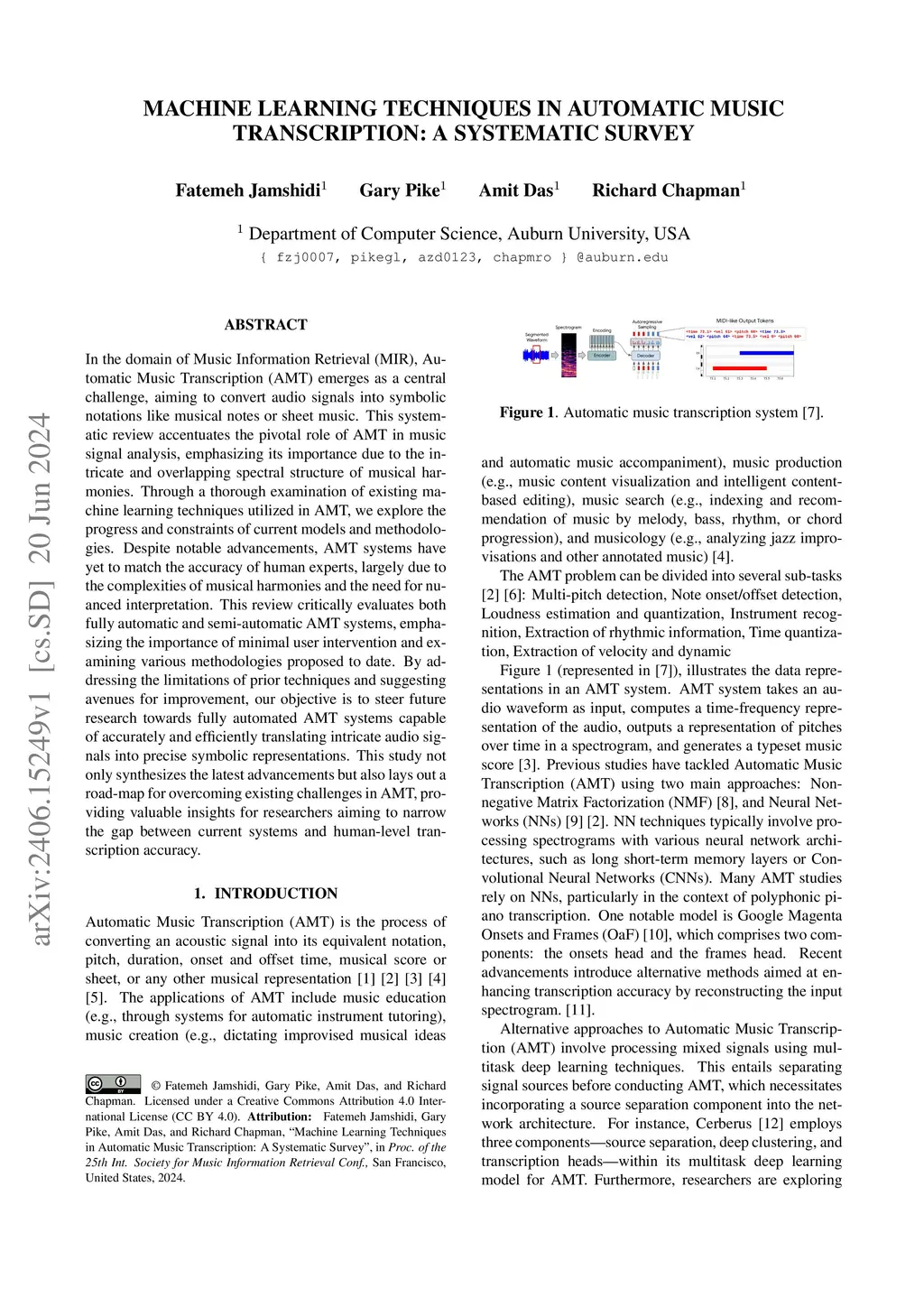 In the domain of Music Information Retrieval (MIR), Automatic Music Transcription (AMT) emerges as a central challenge, aiming to convert audio signals into symbolic notations like musical notes or sheet music. This systematic review accentuates the pivotal role of AMT in music signal analysis, emphasizing its importance due to the intricate and overlapping spectral structure of musical harmonies. Through a thorough examination of existing machine learning techniques utilized in AMT, we explore the progress and constraints of current models and methodologies. Despite notable advancements, AMT systems have yet to match the accuracy of human experts, largely due to the complexities of musical harmonies and the need for nuanced interpretation. This review critically evaluates both fully automatic and semi-automatic AMT systems, emphasizing the importance of minimal user intervention and examining various methodologies proposed to date. By addressing the limitations of prior techniques and suggesting avenues for improvement, our objective is to steer future research towards fully automated AMT systems capable of accurately and efficiently translating intricate audio signals into precise symbolic representations. This study not only synthesizes the latest advancements but also lays out a road-map for overcoming existing challenges in AMT, providing valuable insights for researchers aiming to narrow the gap between current systems and human-level transcription accuracy.